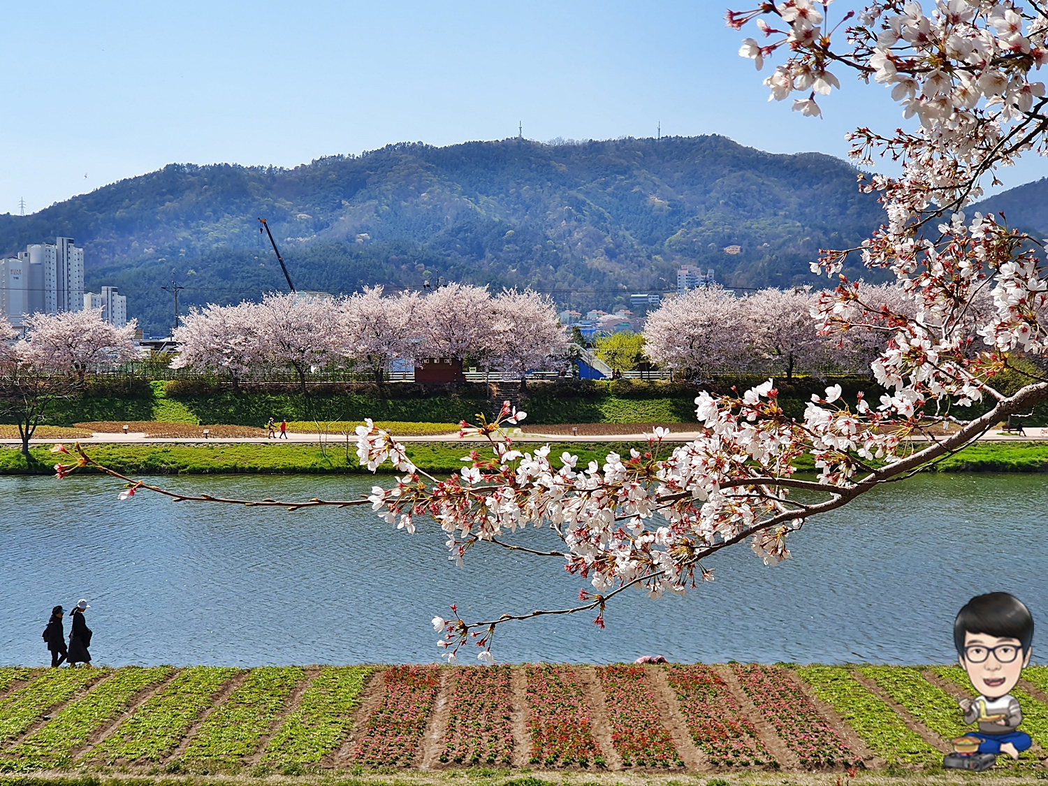 천 양 옆에 수십여 그루의 벚꽃 나무들이 심어져 있었는데, 그 모습이 한 폭의 그림과 같이 너무도 멋졌습니다.