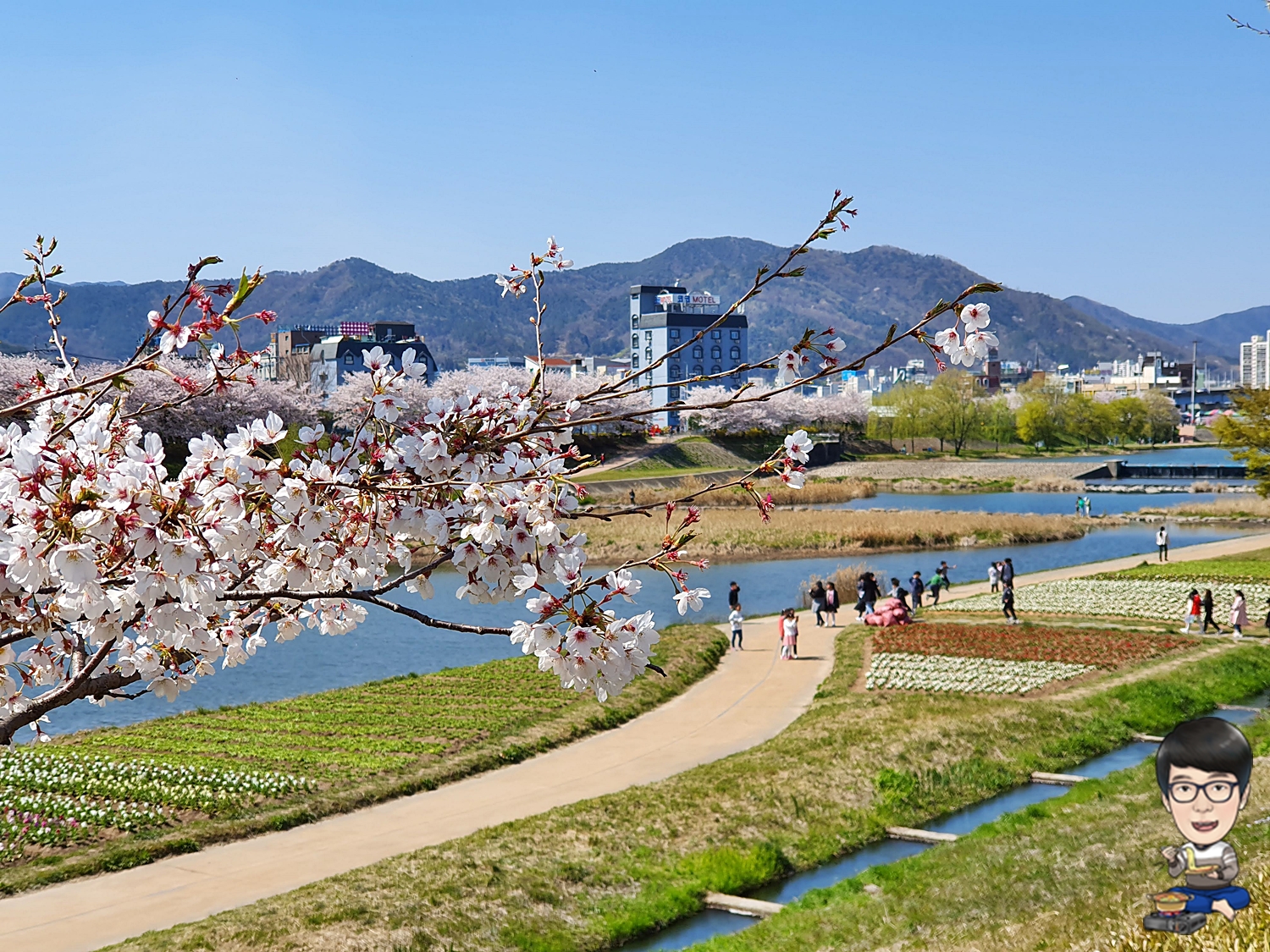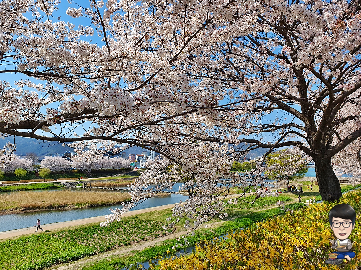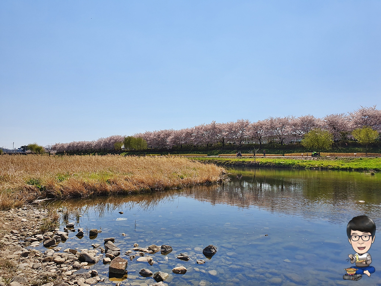 천 양 옆에 수십여 그루의 벚꽃 나무들이 심어져 있었는데, 그 모습이 한 폭의 그림과 같이 너무도 멋졌습니다.