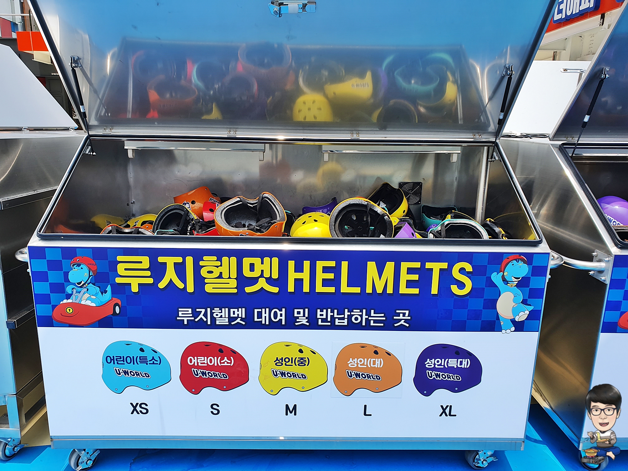 탑승장 입구에 헬멧 보관함이 있어서 자신의 머리 사이즈에 맞는 헬멧을 자유롭게 착용, 반납할 수가 있었습니다.