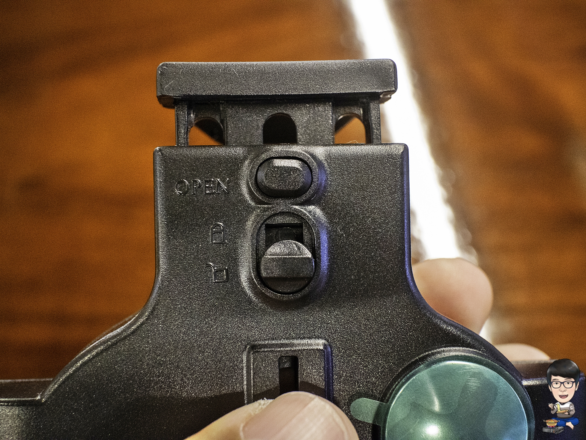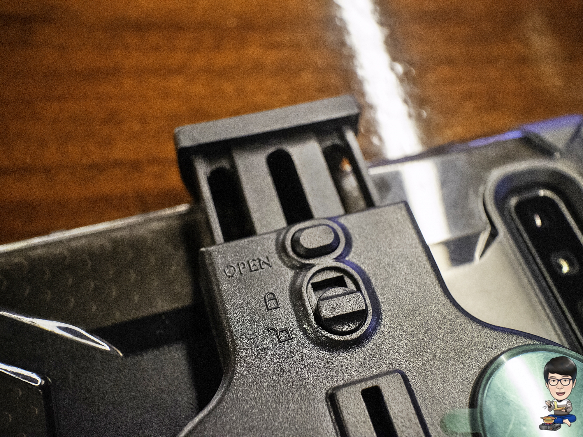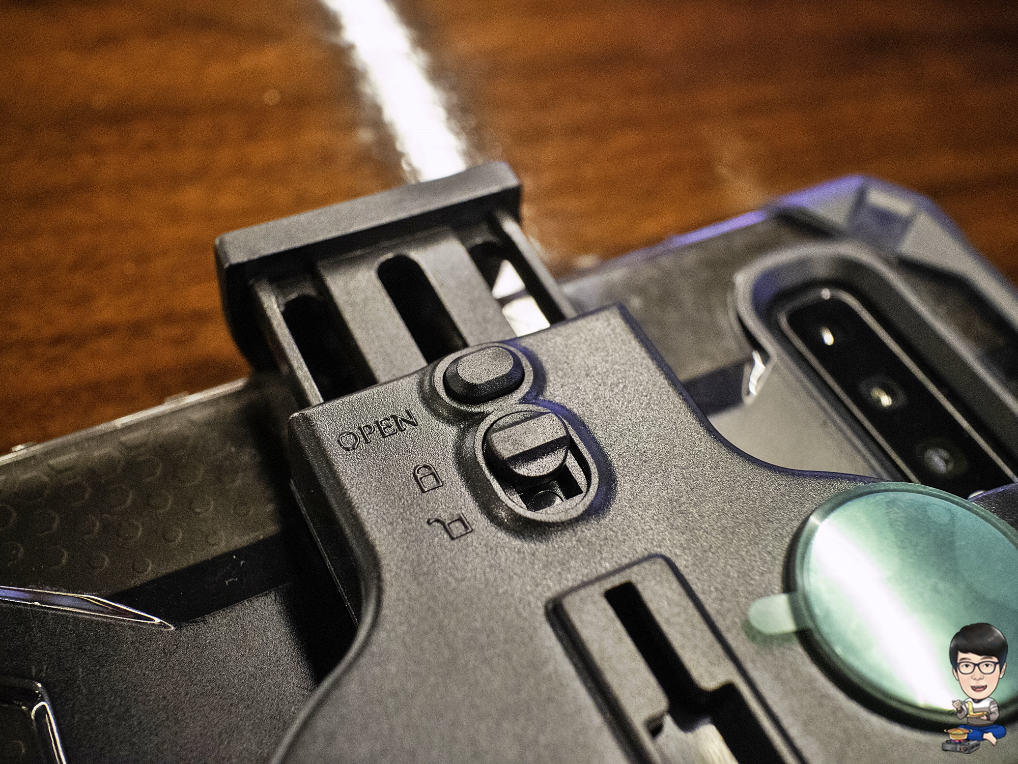 후면의 잠금 레버를 잠금 방향으로 '탁' 소리 날 때까지 올려주면 끝....이라는데 역시 제가 받은 제품에서는 '탁' 소리가 나지 않았습니다. 혹시 OPEN 버튼을 누르면 잠금이 풀리는 것은 아닐까 걱정되서 OPEN 버튼을 눌러봤는데, 잠금 쪽으로 레버가 올려진 상태에서는 버튼이 눌리지 않았습니다.