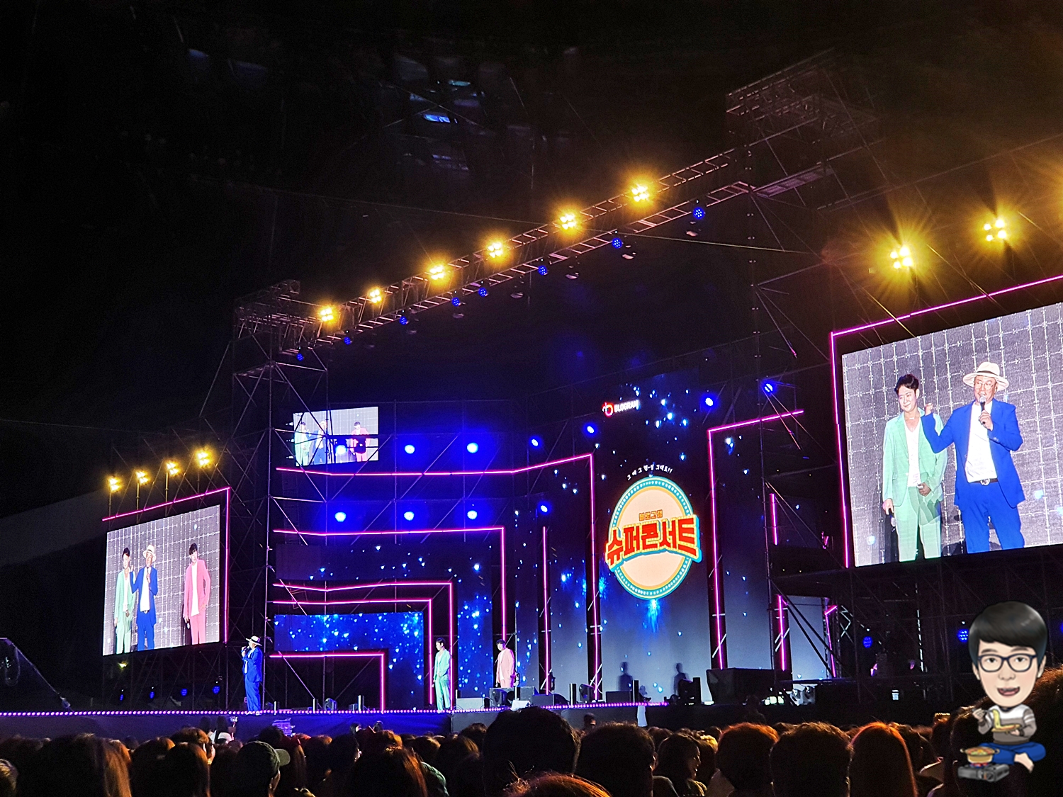 예전에 관람했었던 슈퍼콘서트 토요일을 즐겨라처럼 본 무대를 시작하기 전에 조금은 덜 유명한 연예인들과 용인대 응원단, 태권 시범단 등이 사전 공연을 진행했습니다.