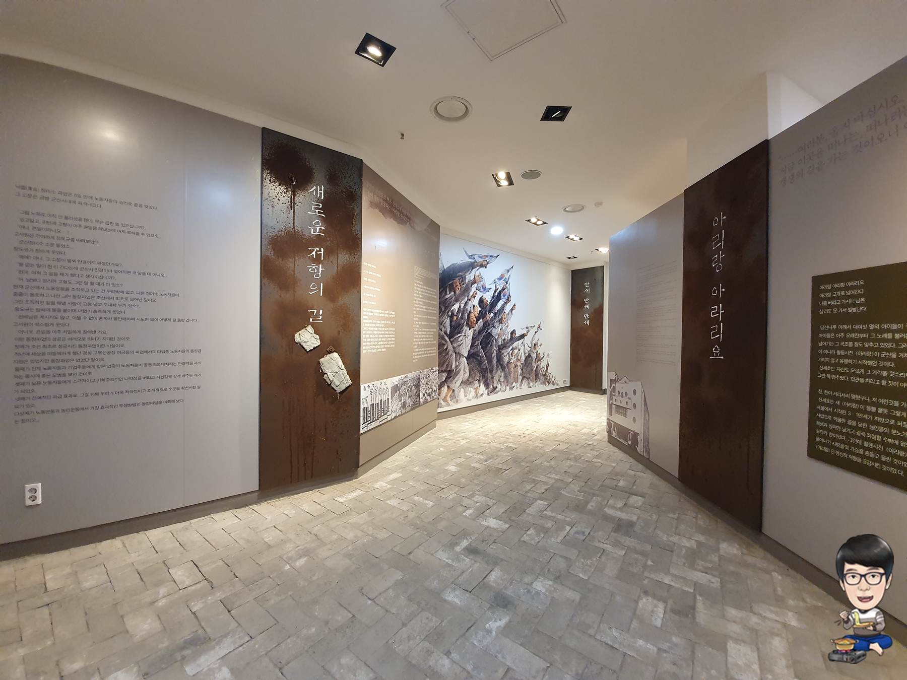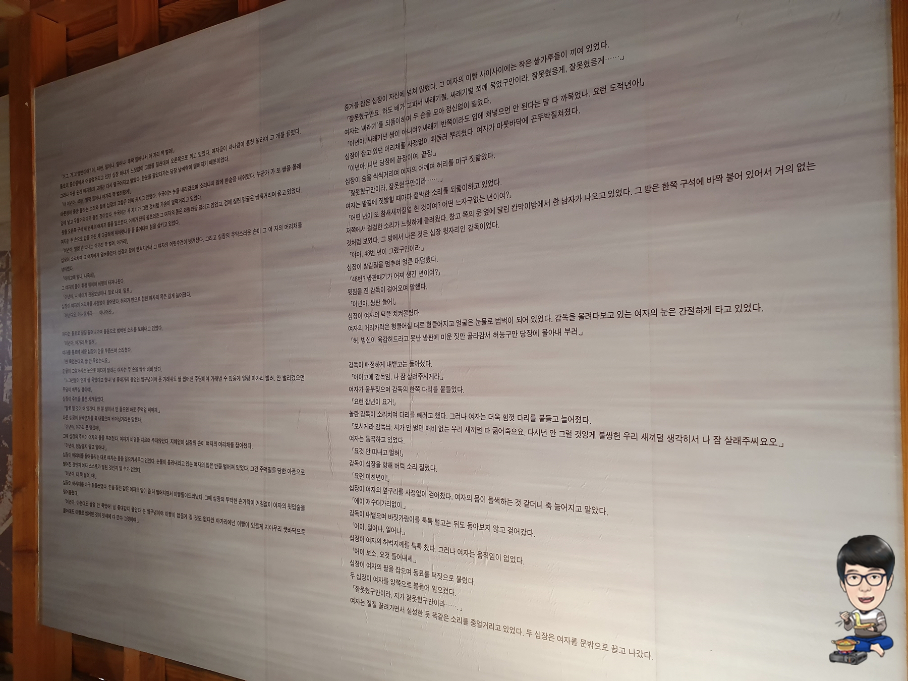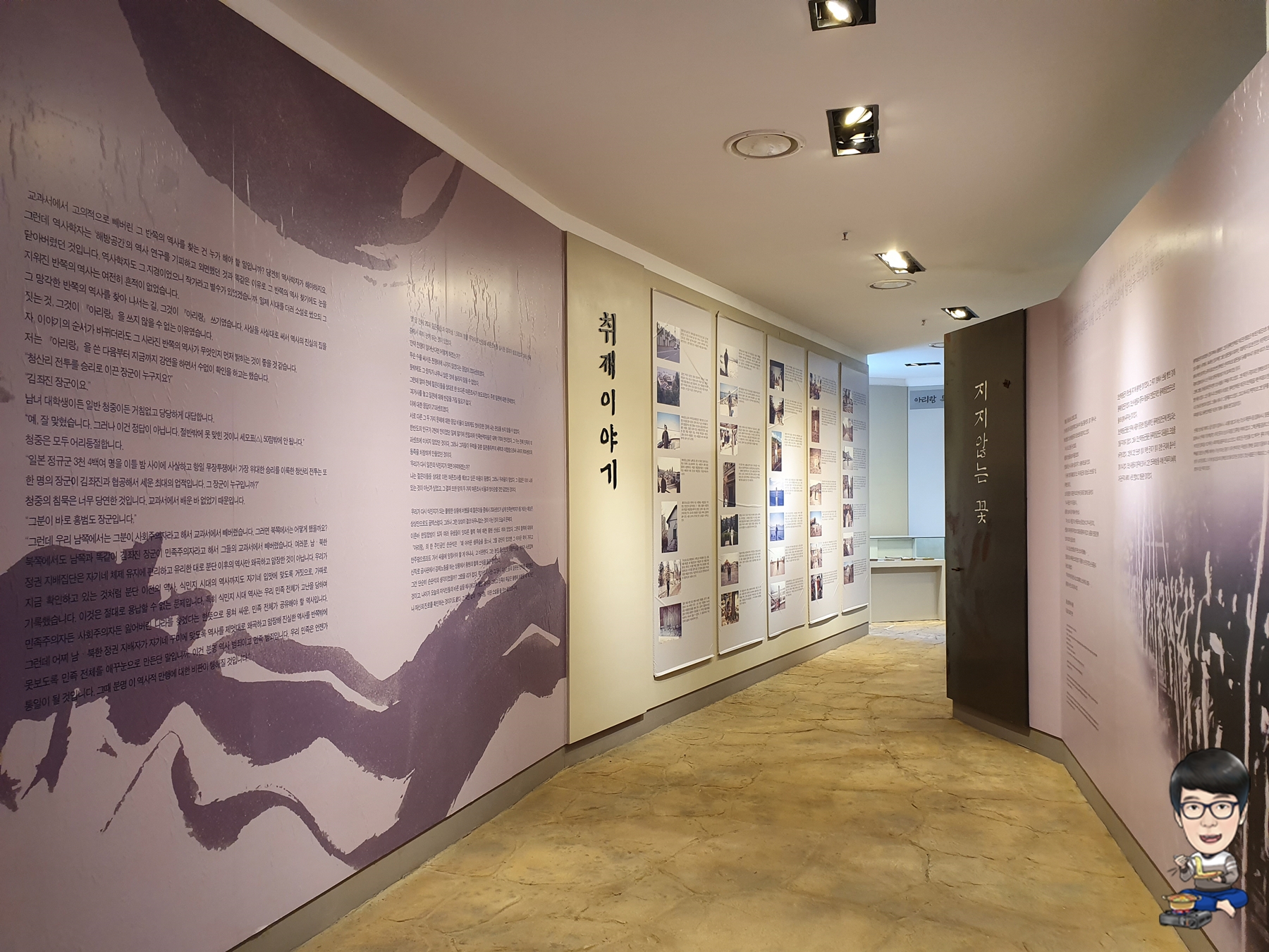 소설 아리랑의 한 구절이 벽면과 내부 스피커를 통해서 흘러나옵니다.