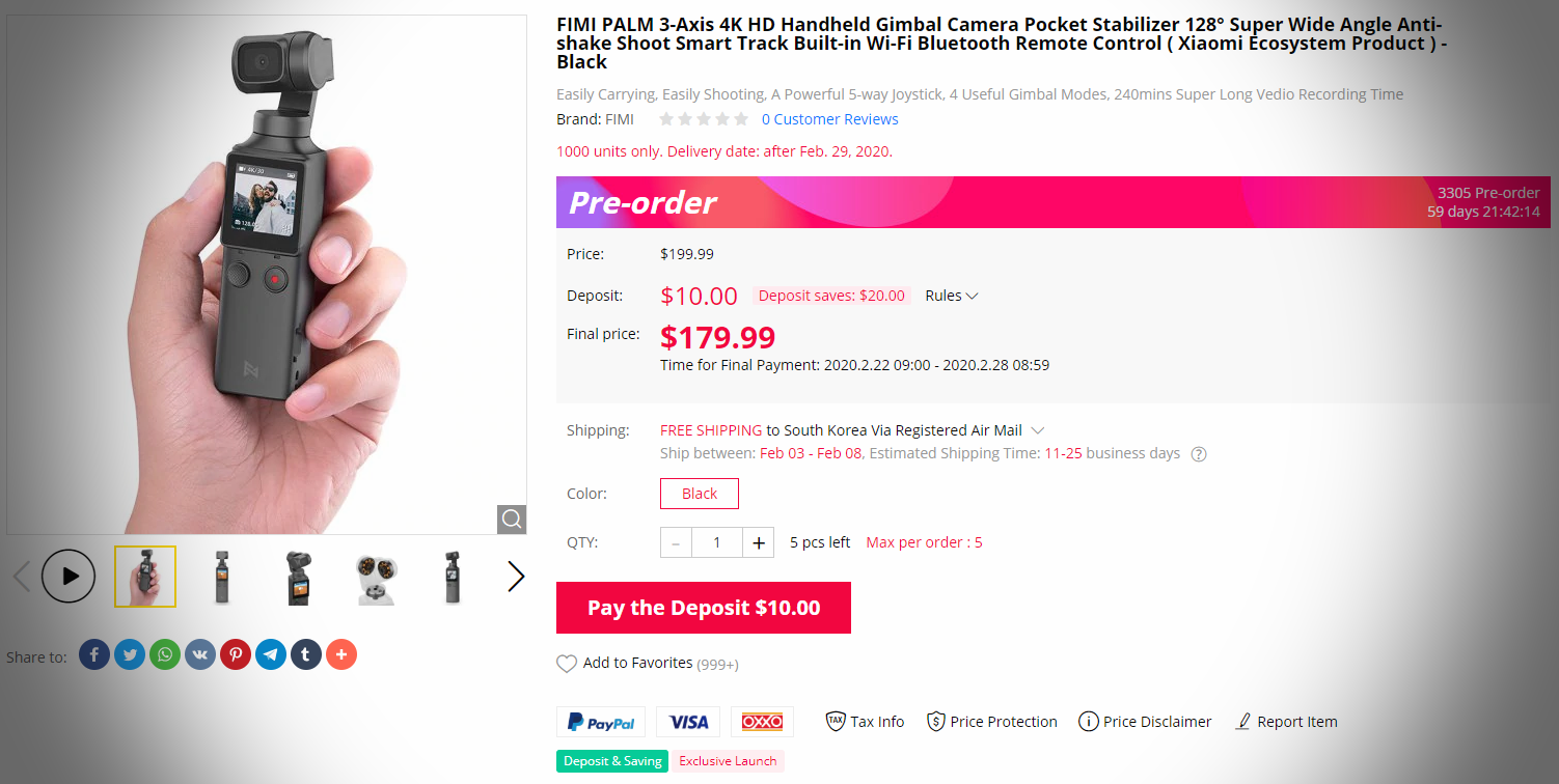 기어베스트(https://www.gearbest.com/gimbal/pp_009765272700.html?wid=1349303)를 통해서 피미팜(FIMI PALM)이라는 제품을 선보였는데요, 제품 가격을 $199.99로 발표한데다가 지금 미리 사전예약을 할 경우 $179.99에 구입을 할 수 있다고 해서 많은 사람들로부터 관심을 받고 있습니다.