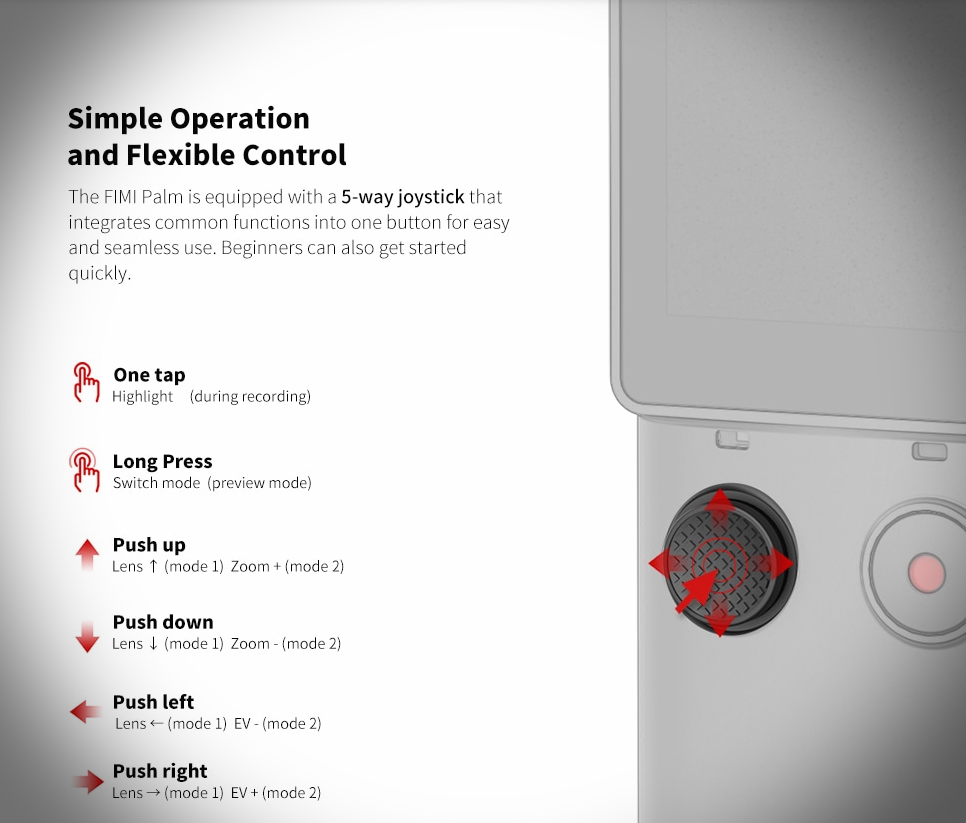 오즈모 포켓은 별도의 외장 컨트롤러 모듈을 구매해야 했는데, 피미 팜은 조이스틱 컨트롤러가 장착되어 있기 때문에 추가 비용없이 보다 쉽게 짐벌을 조작할 수 있다는 장점이 있습니다.