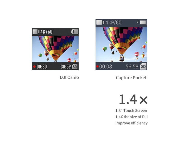 DJI Osmo Pocket 대비 1.4배 더 큰 1.3인치의 TFT LCD 터치스크린이 장착되어 있고, USB C Type의 외장 마이크를 장착할 수 있습니다.