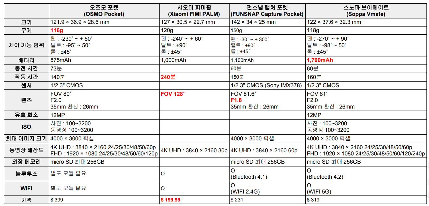 오즈모 포켓을 제외한 다른 기기들은 아직 제품이 출시되지 않은 상태이기 때문에 어떤 기기가 더 좋고, 나쁜지를 정확하게 판단하기가 어렵지만, 공개된 자료들을 통해서 각 기기들이 어떤 특징을 가지고 있는지 알아보겠습니다.