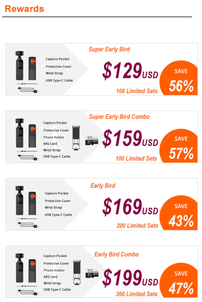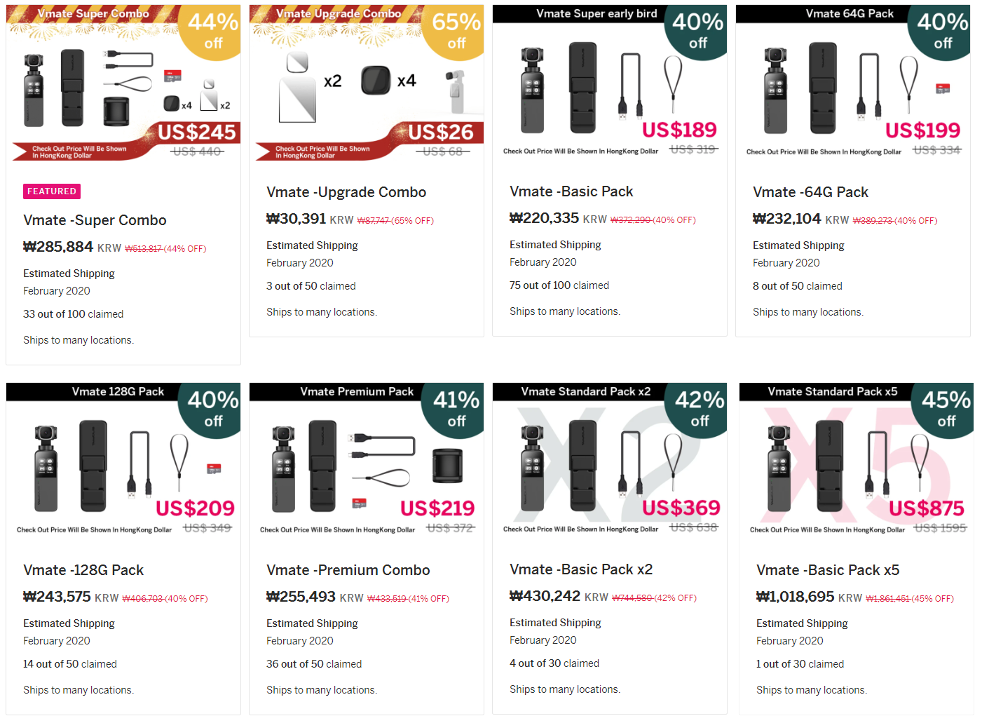 저는 오즈모 포켓 대비 저렴한 가격에 ND필터까지 제공된다는 점에 끌려서 US $245에 Vmate - Super Combo를 펀딩해 둔 상태인데요, 2020년 2월 배송 예정이라고 하니 물건이 도착하는대로 후기 등록하겠습니다.