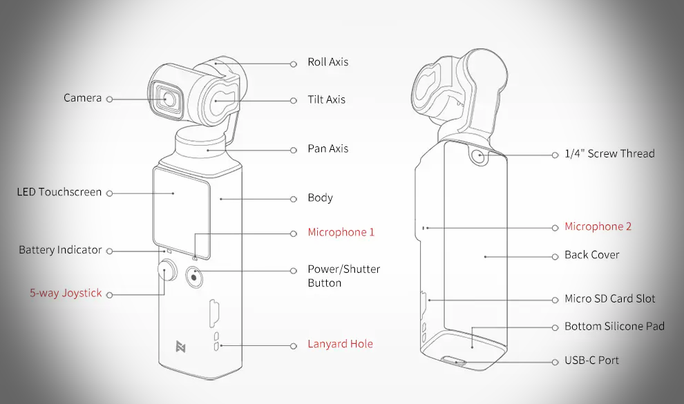DJI Osmo Pocket 대비 1.4배 더 큰 1.3인치의 TFT LCD 터치스크린이 장착되어 있고, USB C Type의 외장 마이크를 장착할 수 있습니다.