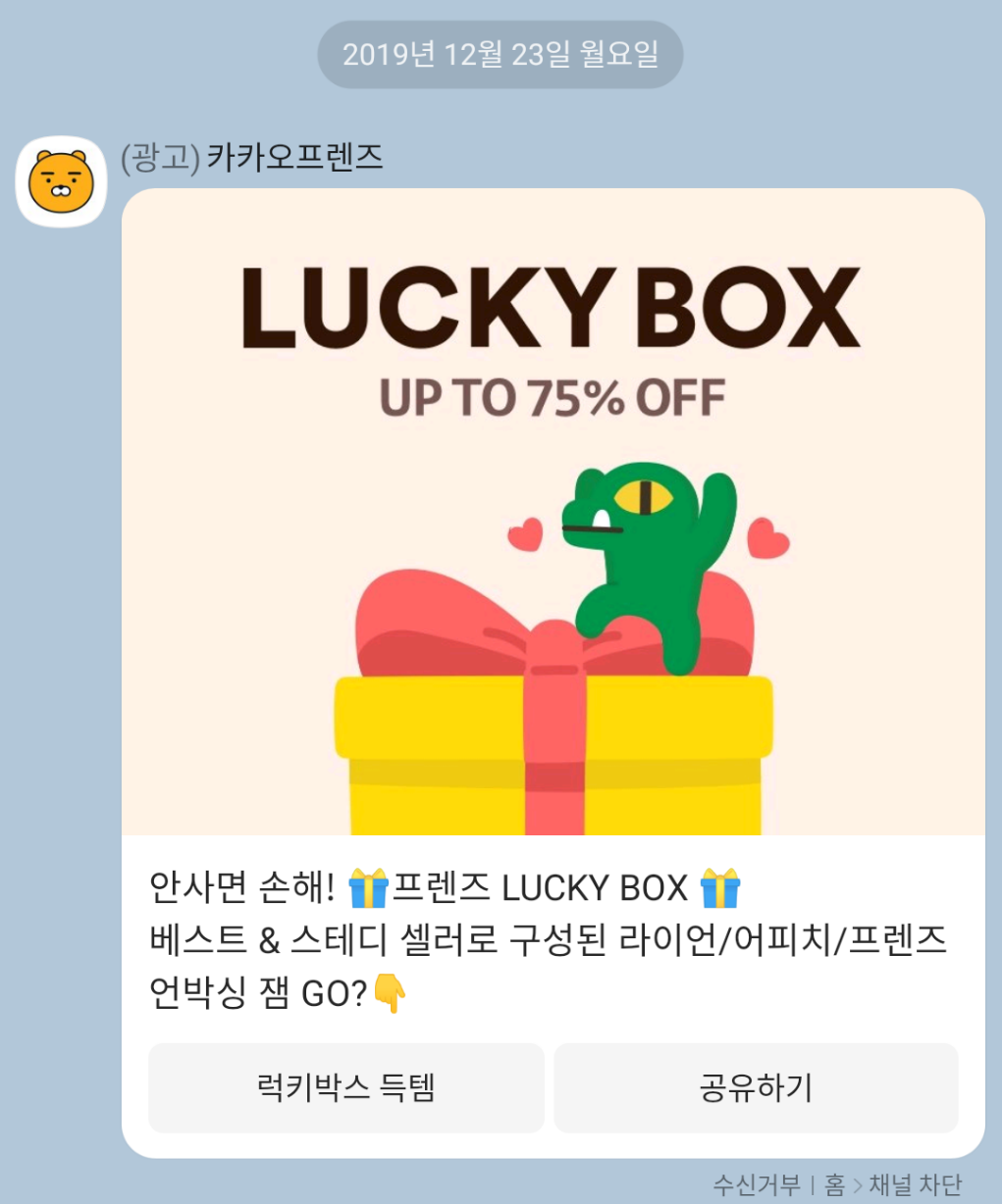 75% 할인률을 자랑하는 어마어마한 상품이 기다리고 있다며 라이언/어피치/프렌즈 럭키박스를 구매하라는데...