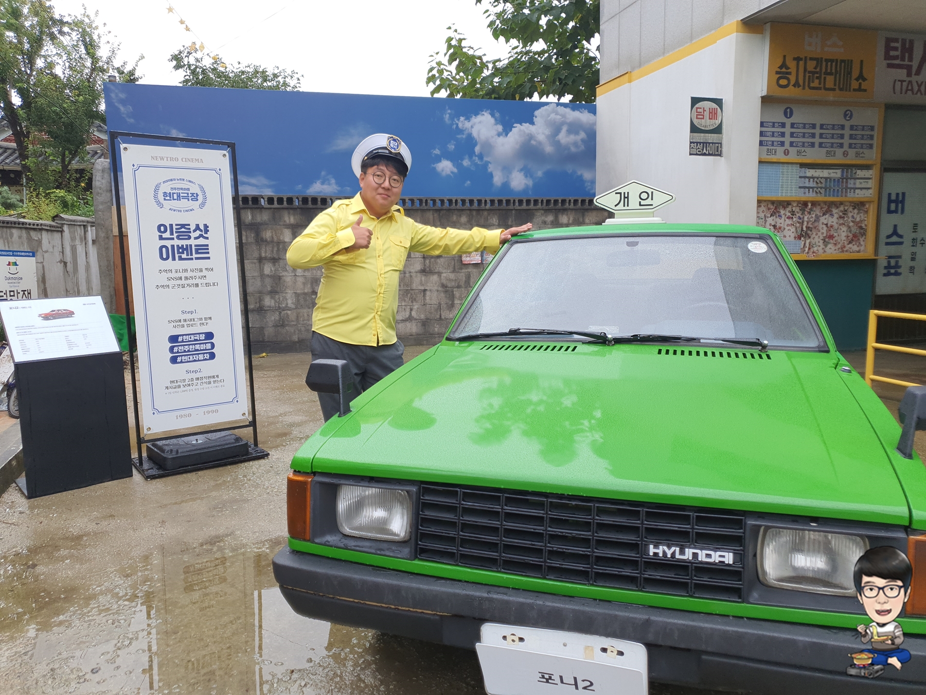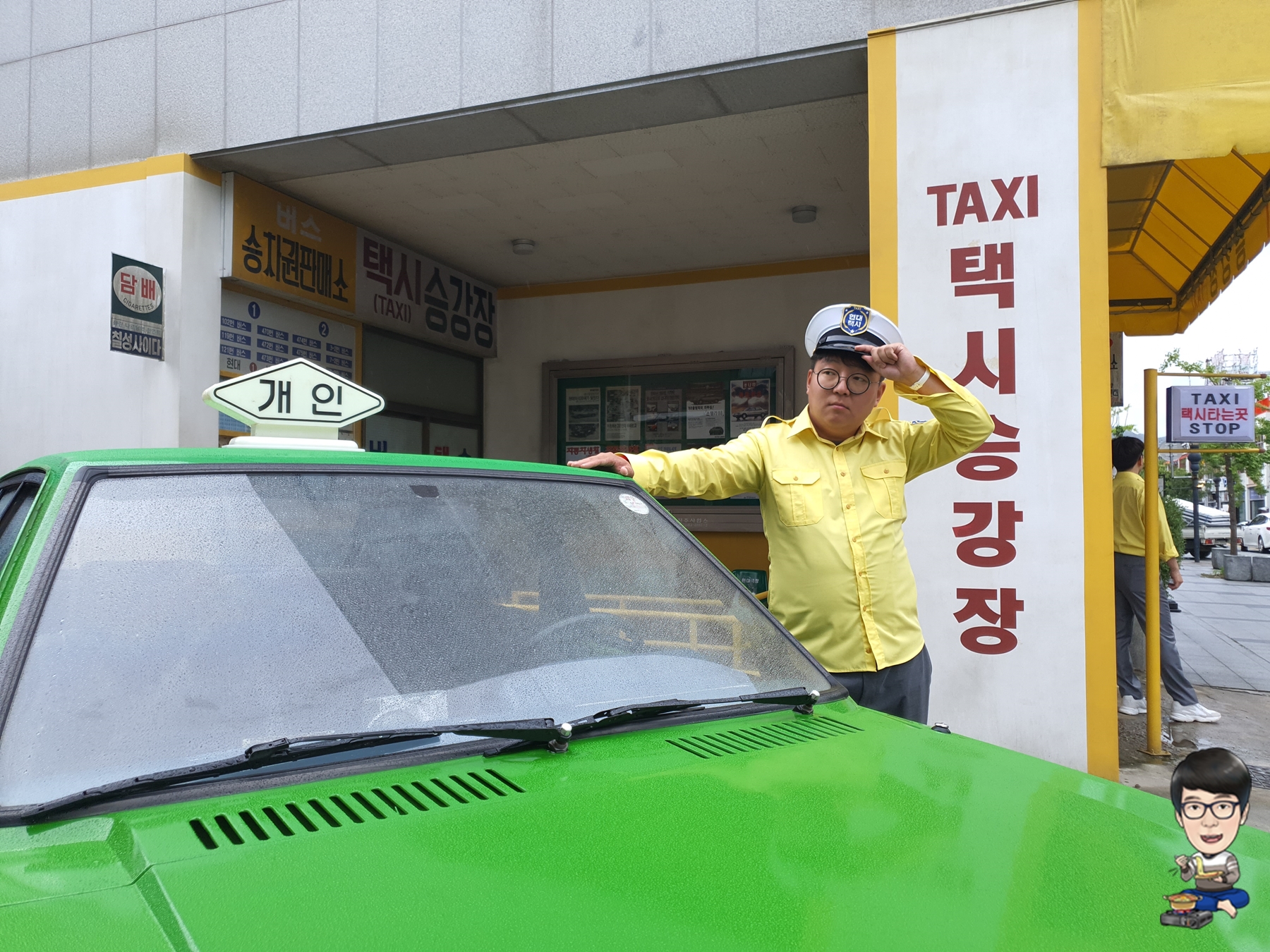 이 택시승강장에서는 영화 '택시운전사'에서 배우 송강호님이 입었던 것과 같은 노란 티셔츠와 지금은 대한민국에서 찾아보기 힘든 택시운전사 모자를 무료로 대여해서 사진을 찍을 수 있었습니다.