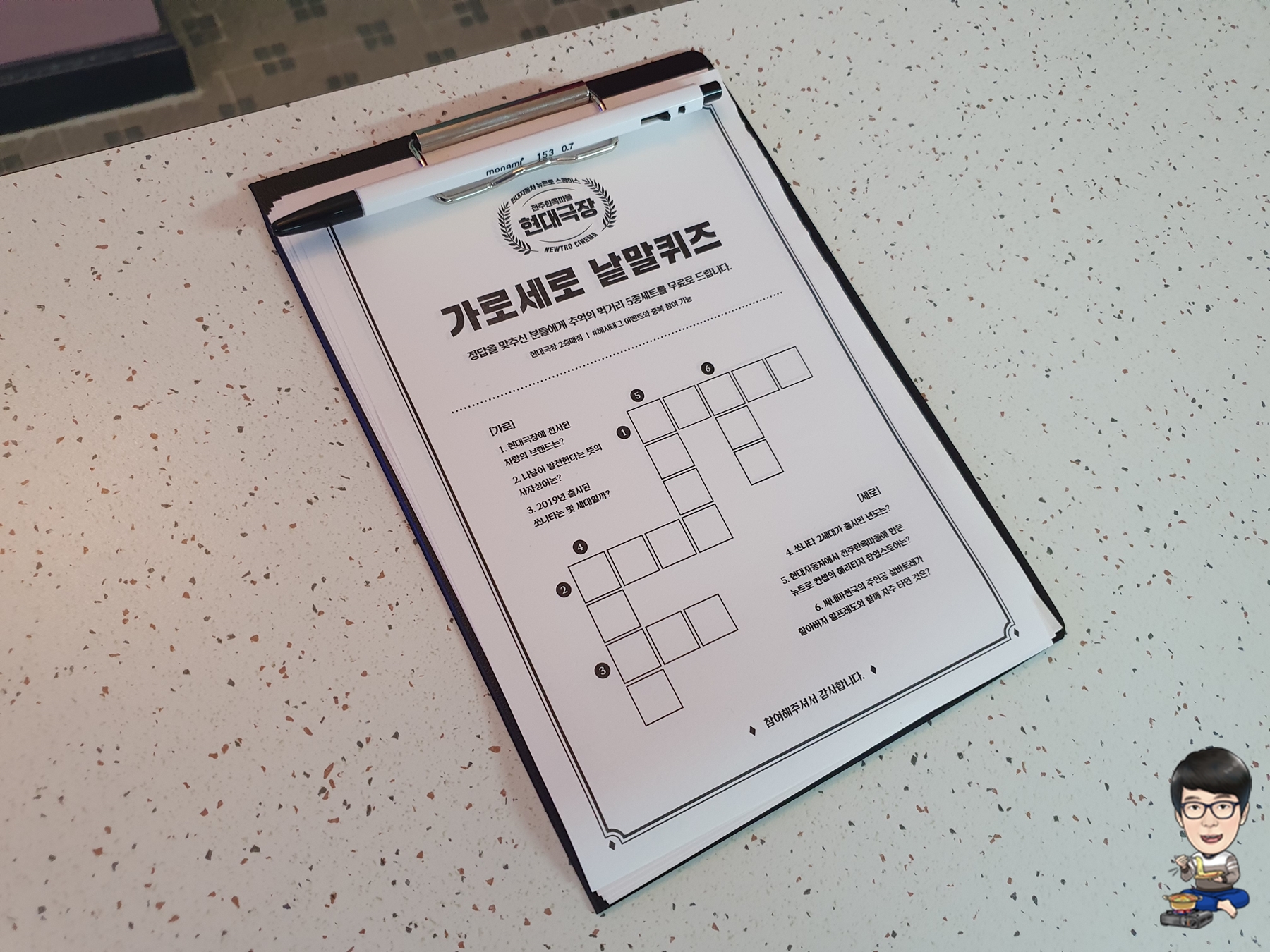 대신 테이블마다 가로세로 낱말퀴즈가 있는데, 이걸 풀고, SNS에 현대극장 체험 사진을 등록하면 추억의 과자와 음료수를 선물로 줬습니다.