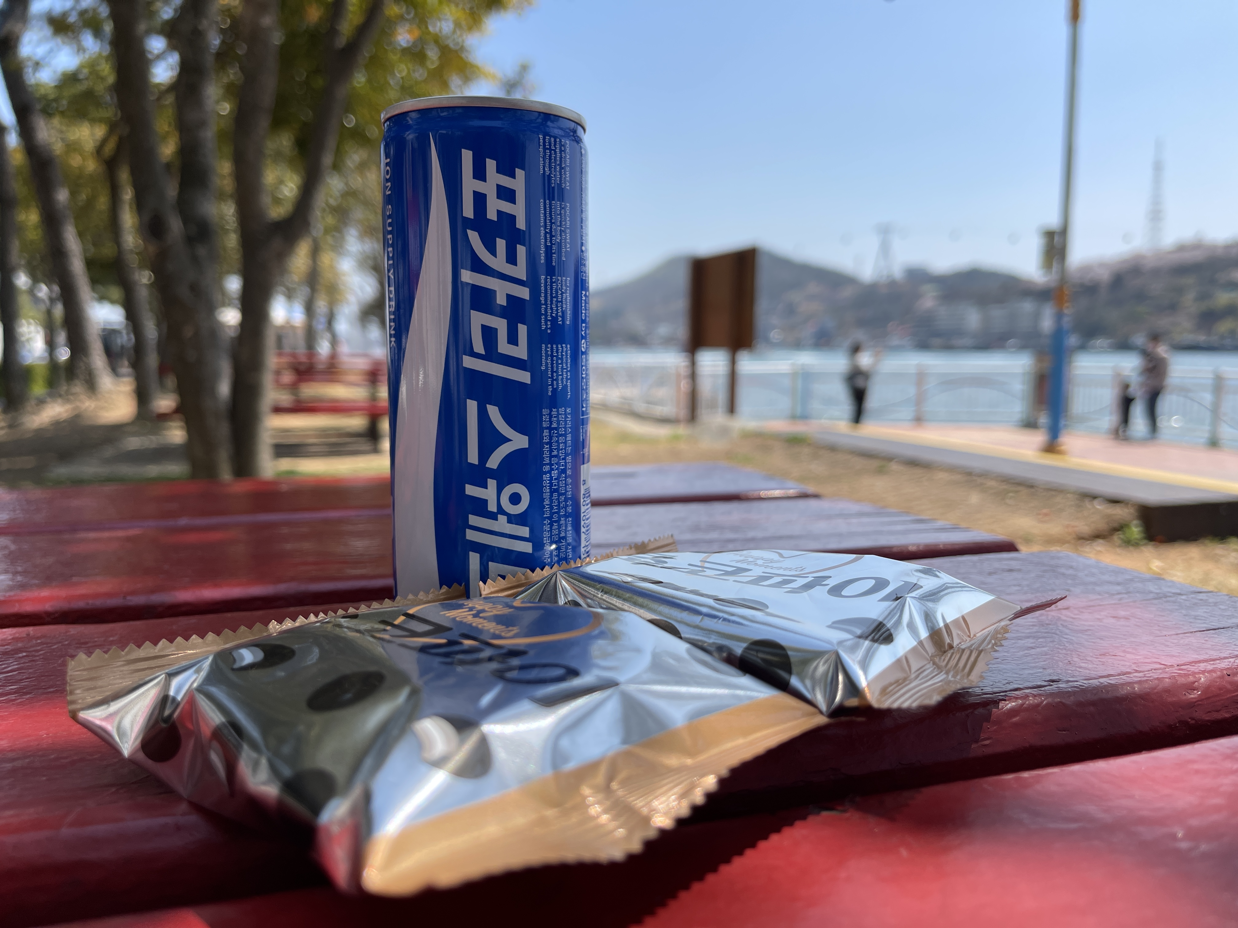 주변 다른 벤치에 사람들이 없는 것을 확인하고 잠시 마스크를 벗고 초코파이로 당분을 채워줍니다.