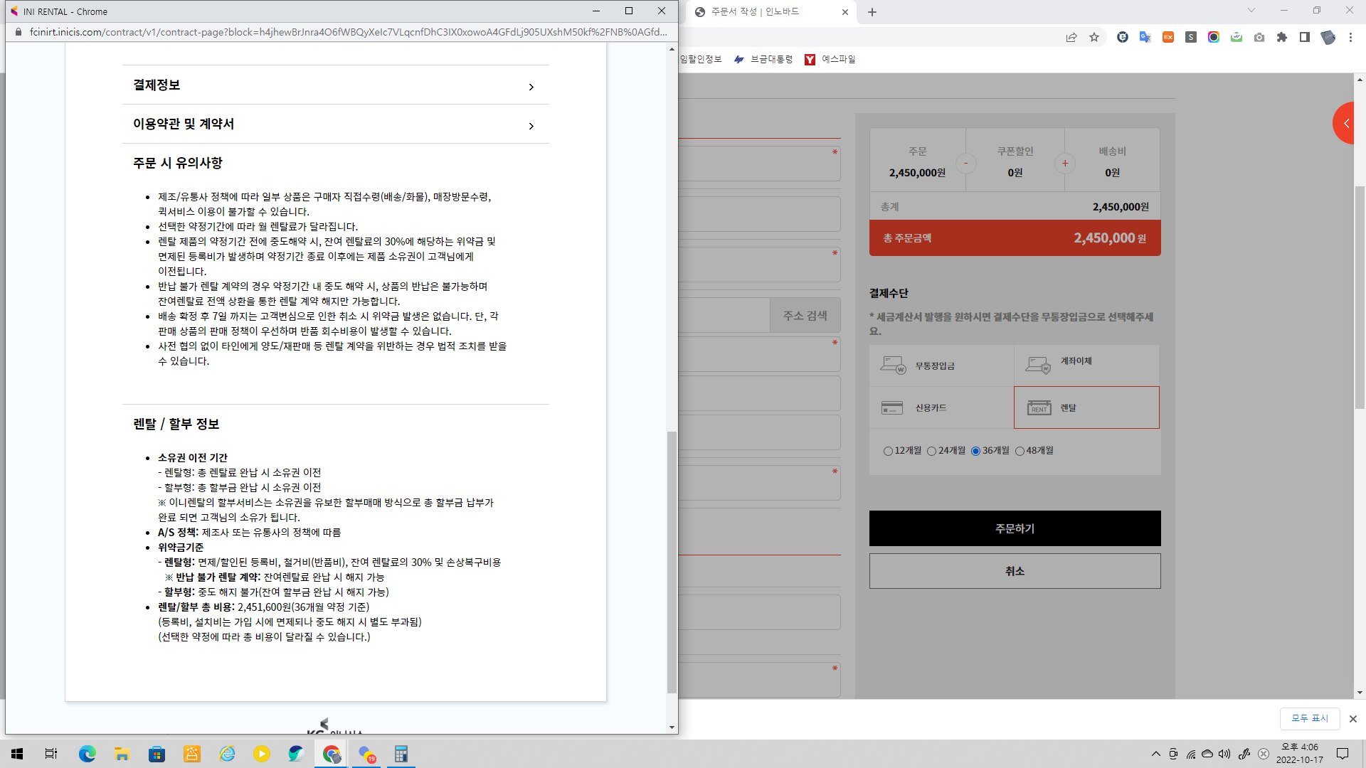 36개월 렌탈을 선택했더니 총 비용이 2,451,600원으로 바뀌었습니다.