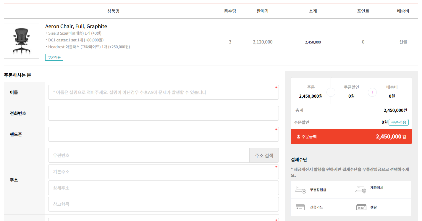 바퀴 변경하고 헤드레스트를 추가했더니 최종 주문 금액이 2,450,000원이 되었습니다.