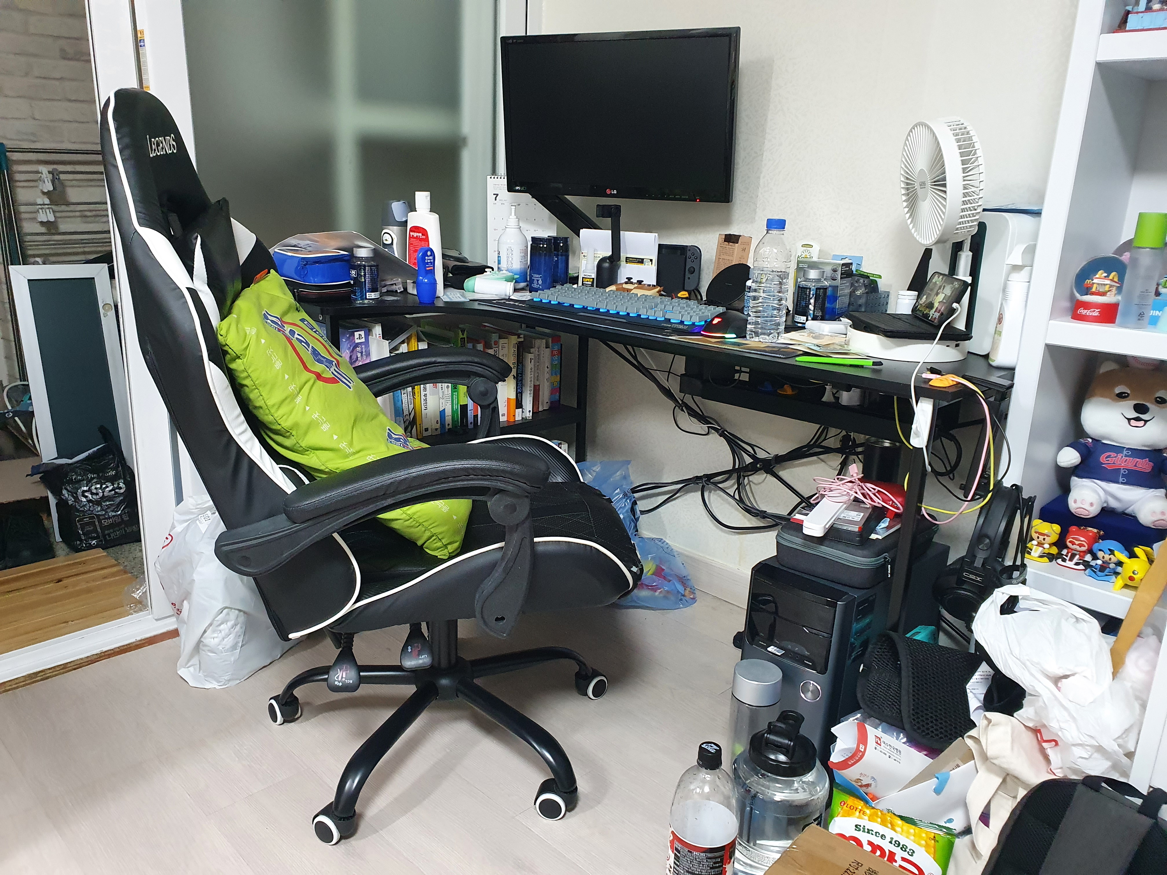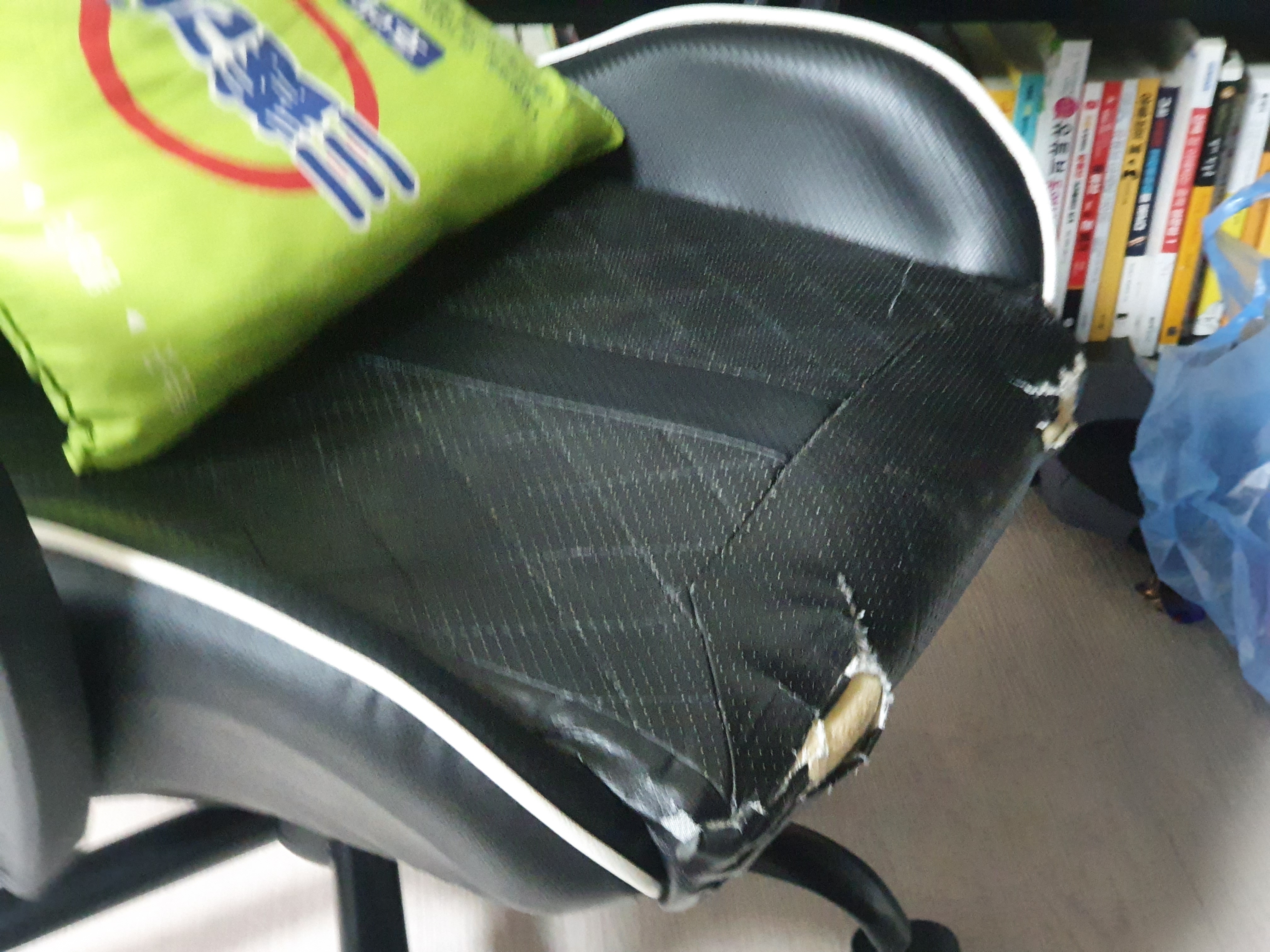 그 동안은 저가의 게이밍의자를 사용하고 있었는데, 사용한지 오래되어 사진처럼 방석 부분이 헤지기도 했고, 이 의자에 앉아 있으면 허리가 아파서 당장 의자부터 바꿔야겠다고 마음먹게 되었습니다.