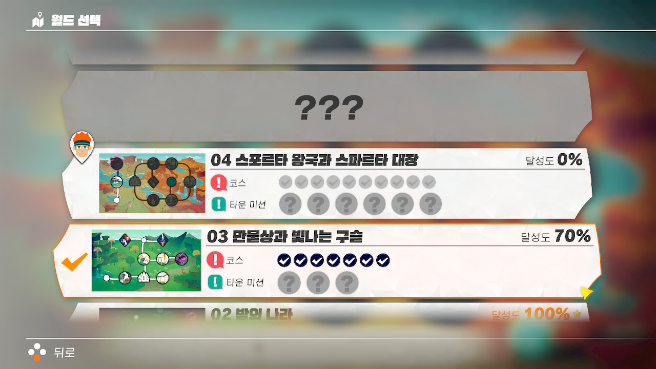 월드 1과 2는 달성도 100%로 클리어했는데, 스테이지 3은 달성도가 70%인 상태입니다.