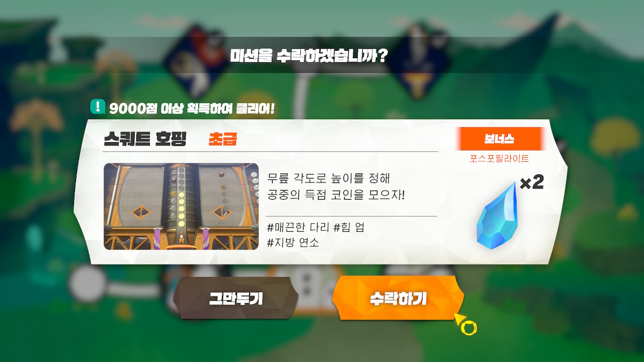 게임 짐 접수원이 미션을 제공했는데, 각각 만세 GET이라는 게임과 스쿼트 호핑이라는 게임을 플레이해서 일정 점수 이상을 획득하라는 내용을 하고 있었습니다.