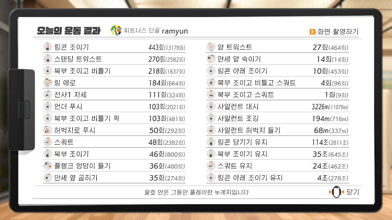 오늘은 200kcal 이상 소비하는 것을 목표로 플레이해서 평소보다 플레이 시간이 길어졌습니다.