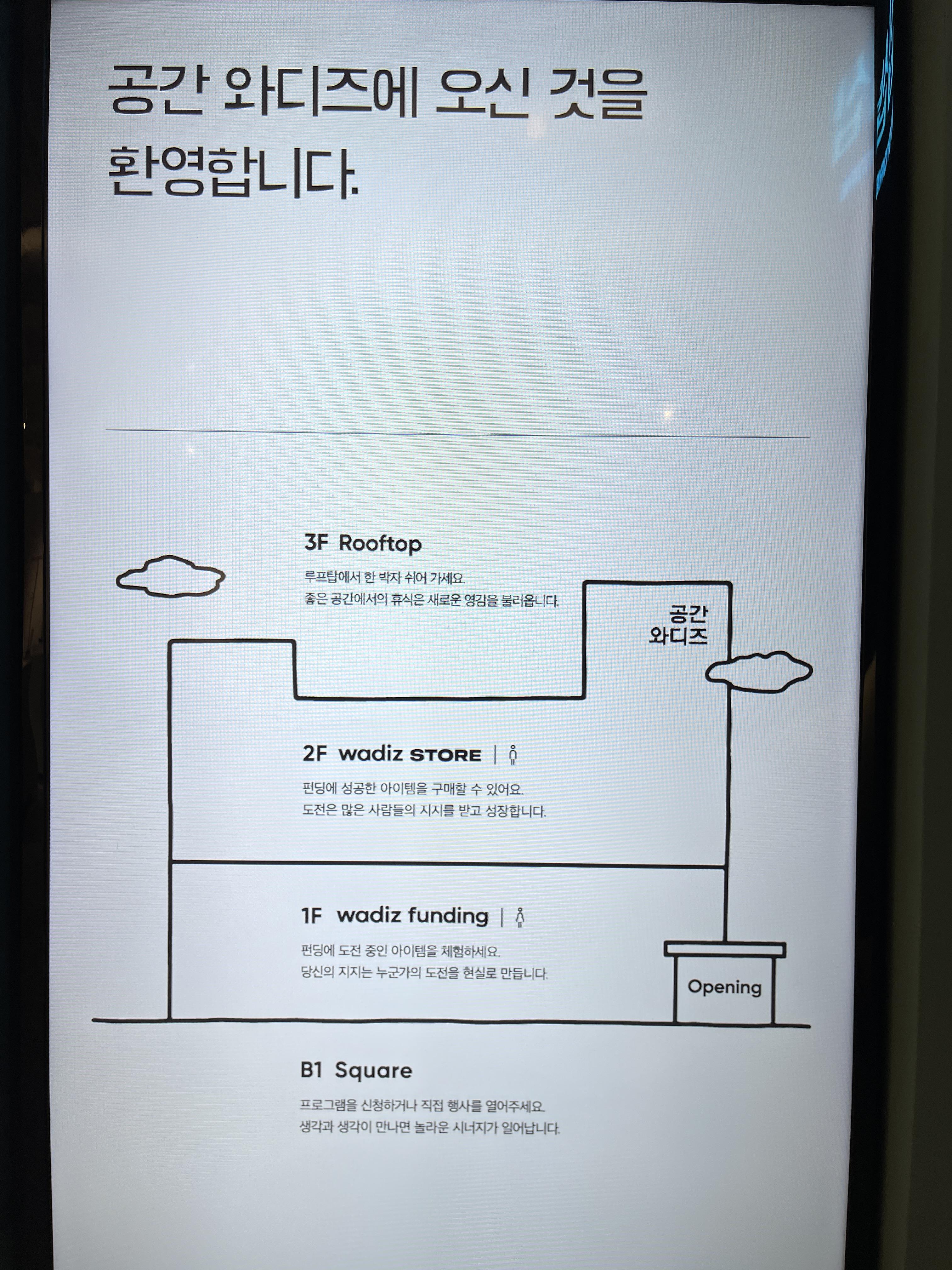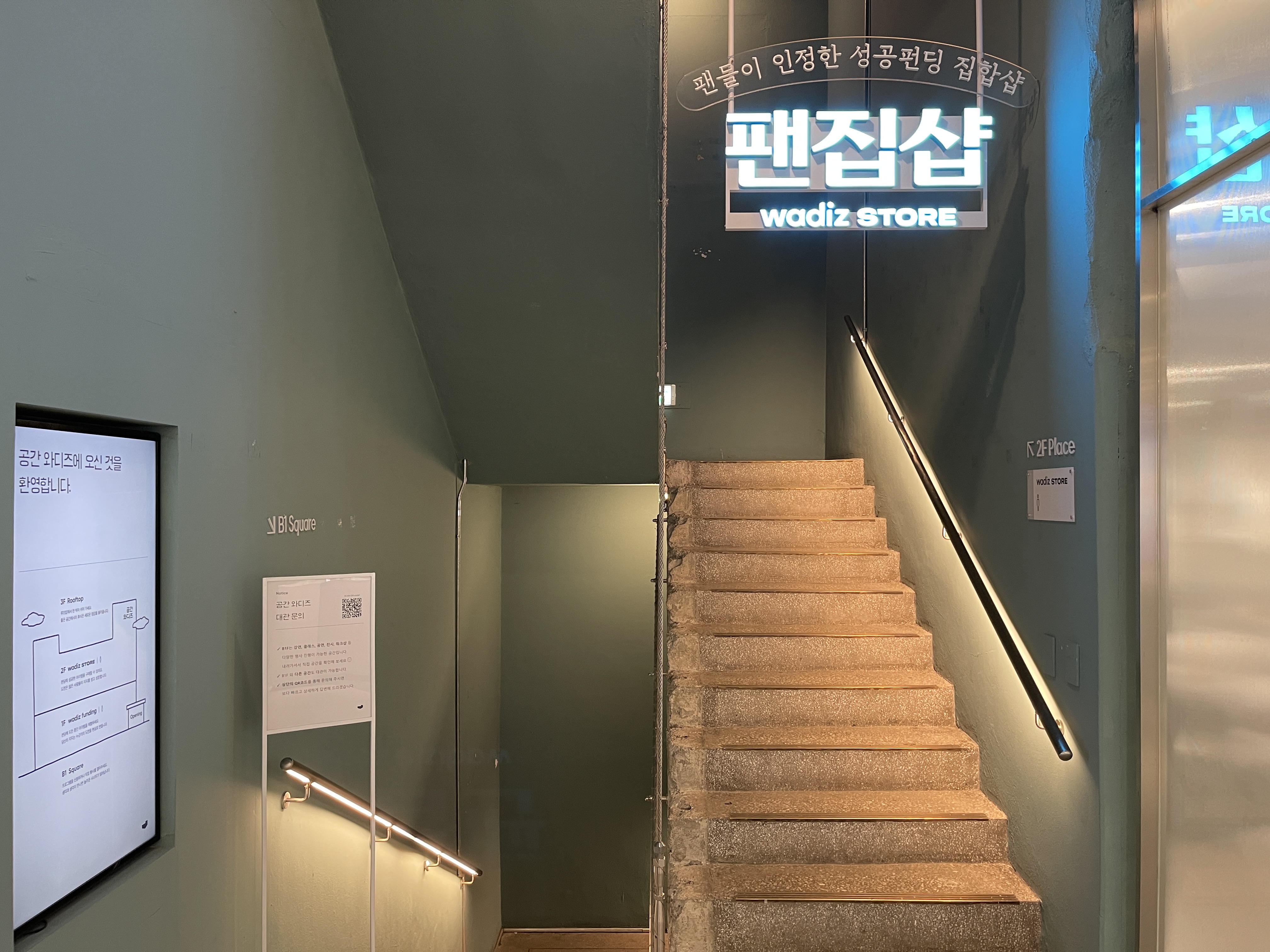 공간 와디즈는 지하 1층, 지상 3층 구조로 이뤄졌는데 지하층은 크라우드 펀딩에 참여하는 파트너사를 위한 대여 공간이고, 1층은 아까도 이야기했던 것처럼 펀딩 진행 중인 상품을 만나 볼 수 있는 체험 공간, 2층은 펀딩에 성공한 상품을 구매할 수 있는 공간으로 이뤄져 있습니다.
