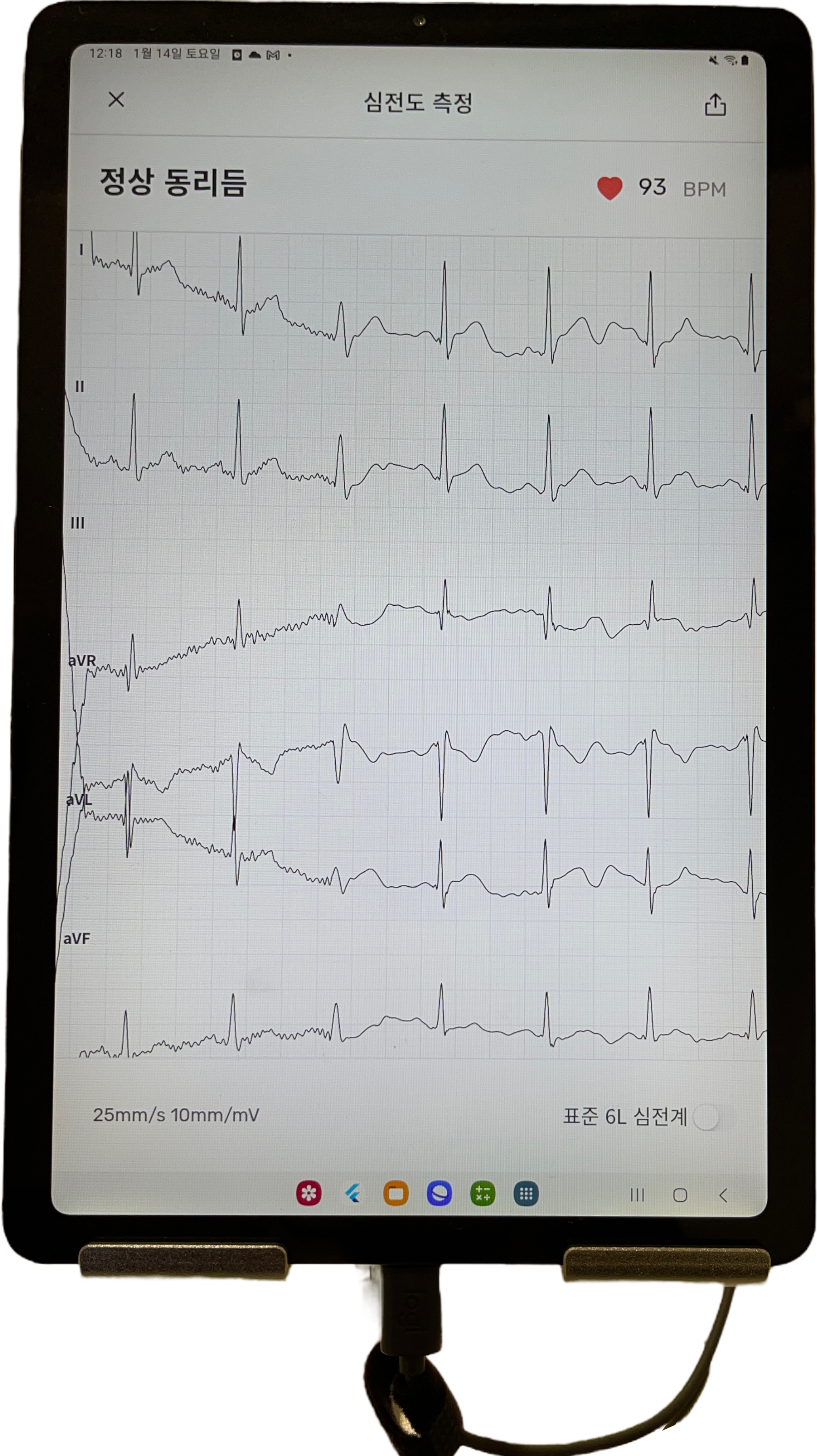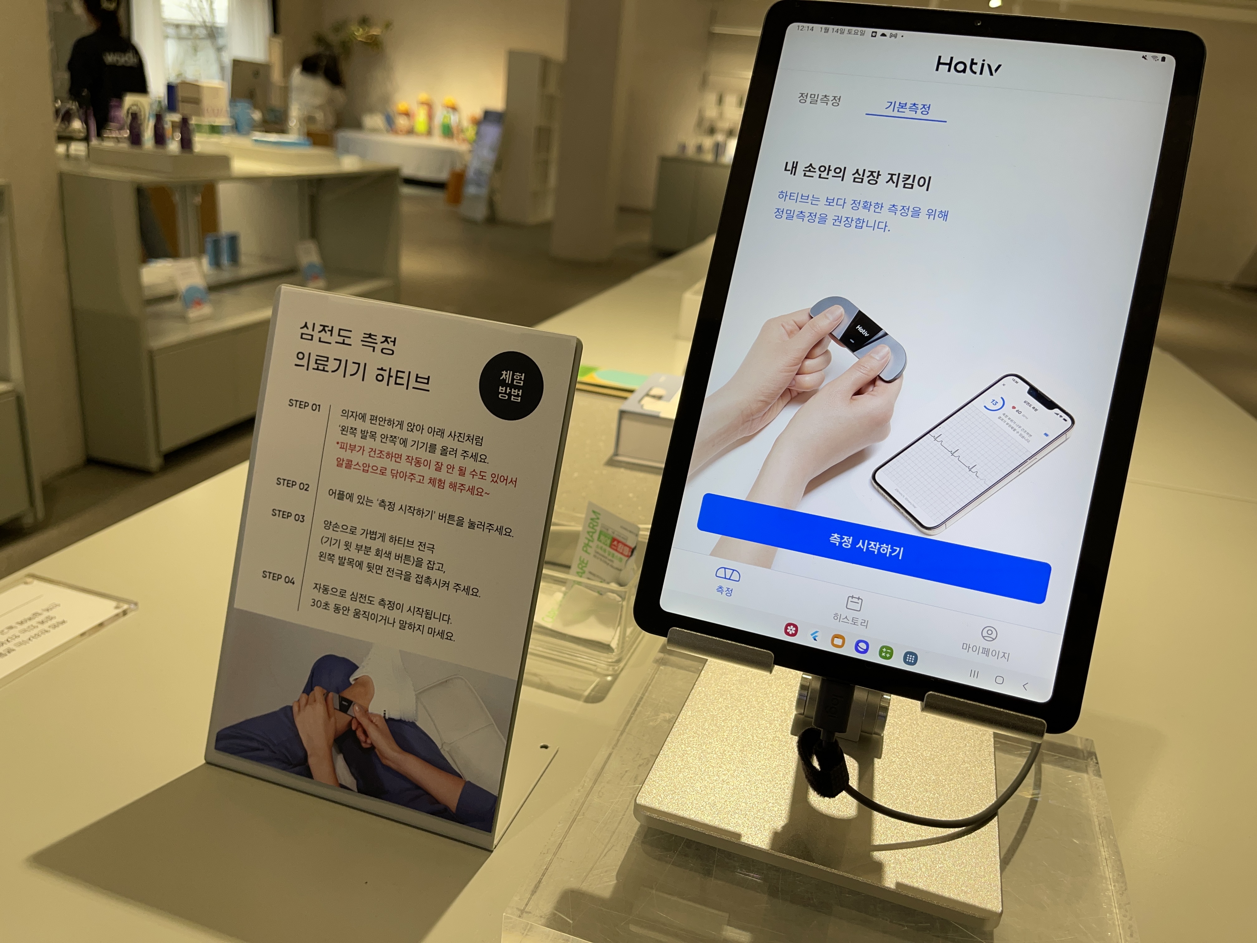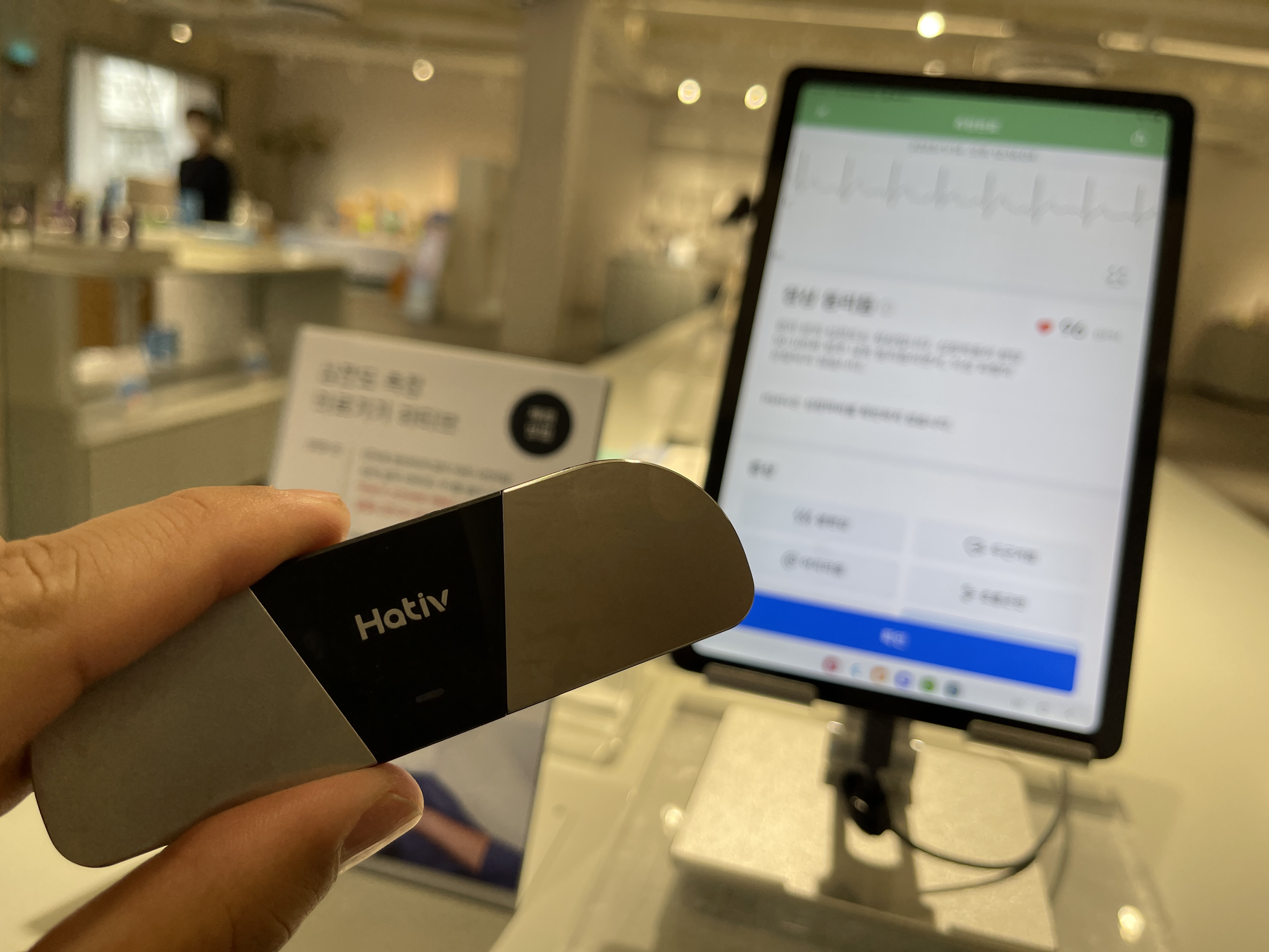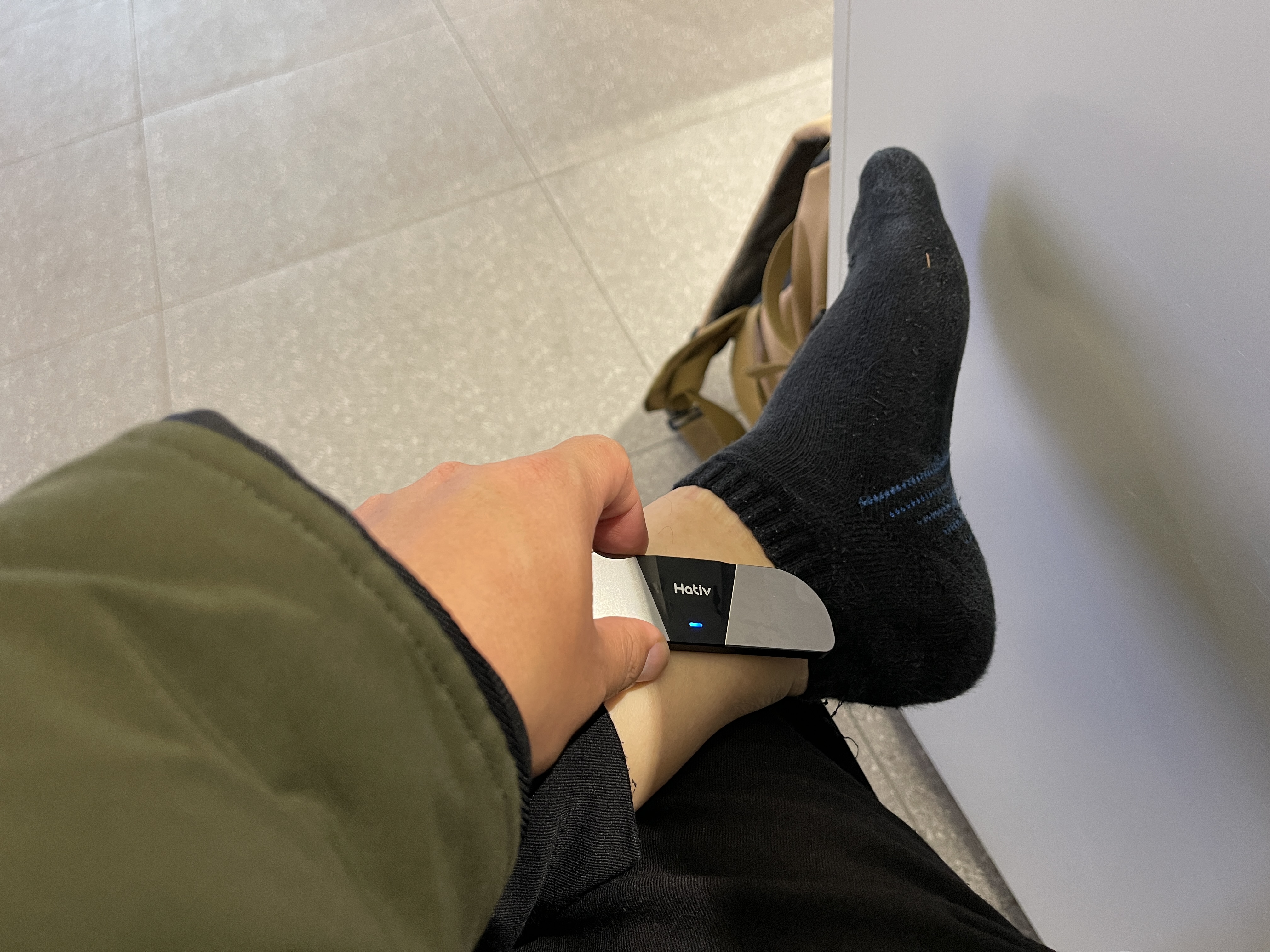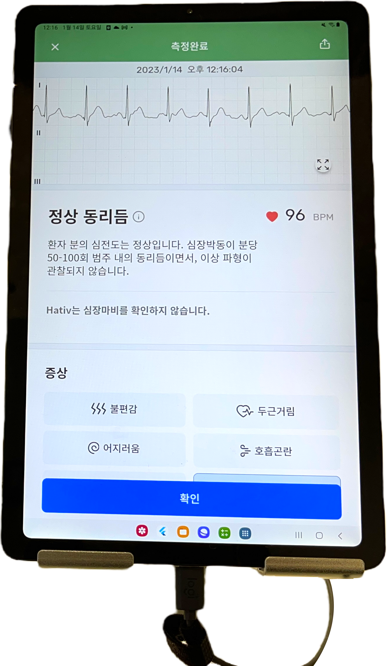 이건 심전도 측정기기였는데, 작고 가볍지만 측정을 위해서는 위 사진처럼 왼쪽 발목에 기기를 가져다 대고, 양 쪽 엄지손가락으로 기기를 눌러줘야 하는.... 약간 불편한 방식을 사용하고 있었습니다.