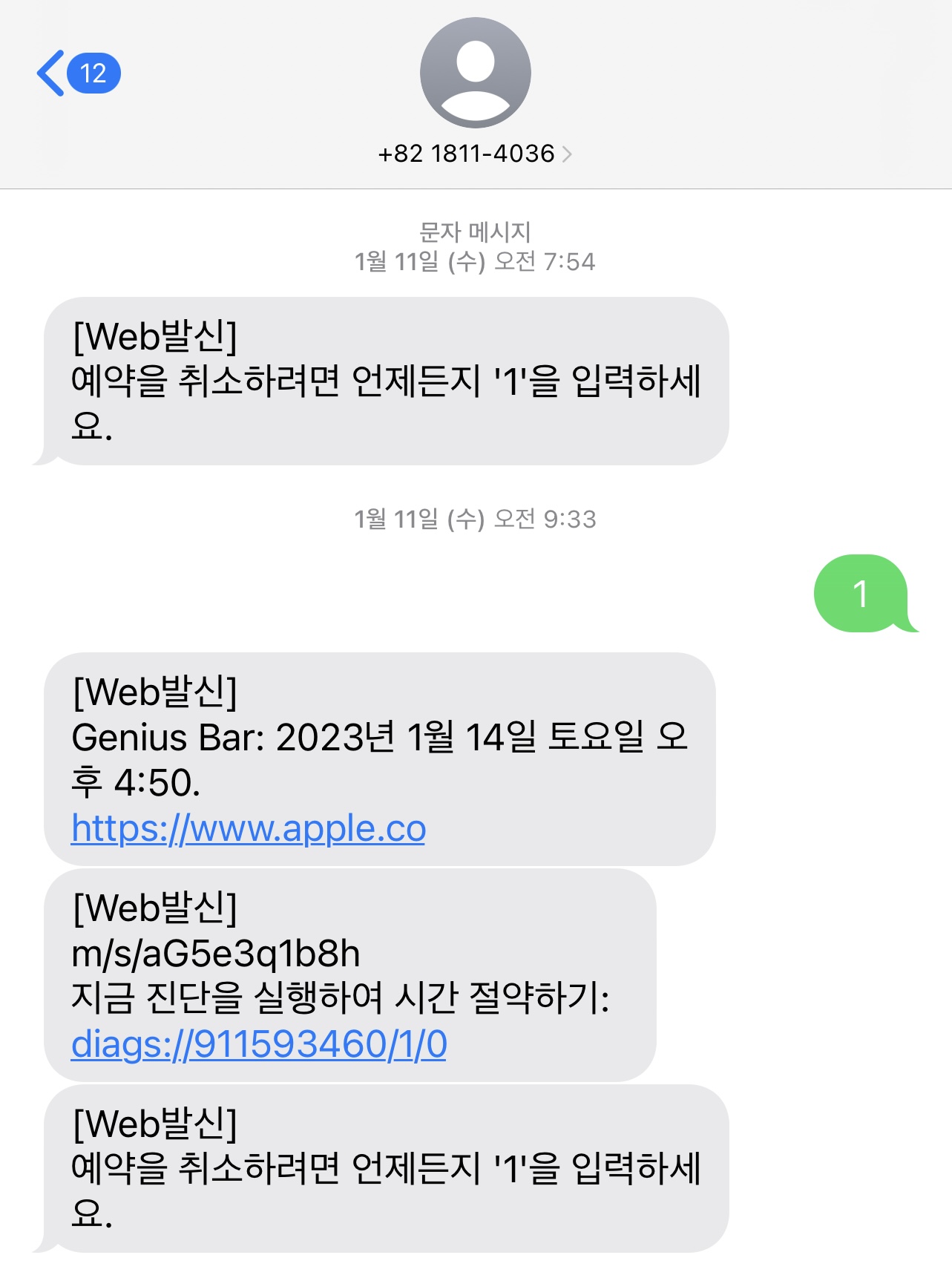 혹여 예약을 취소하려면 문자 메시지에서 숫자 1을 눌러서 전송하면 됩니다.