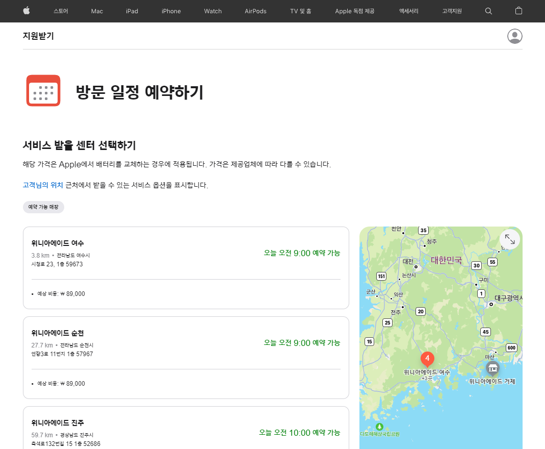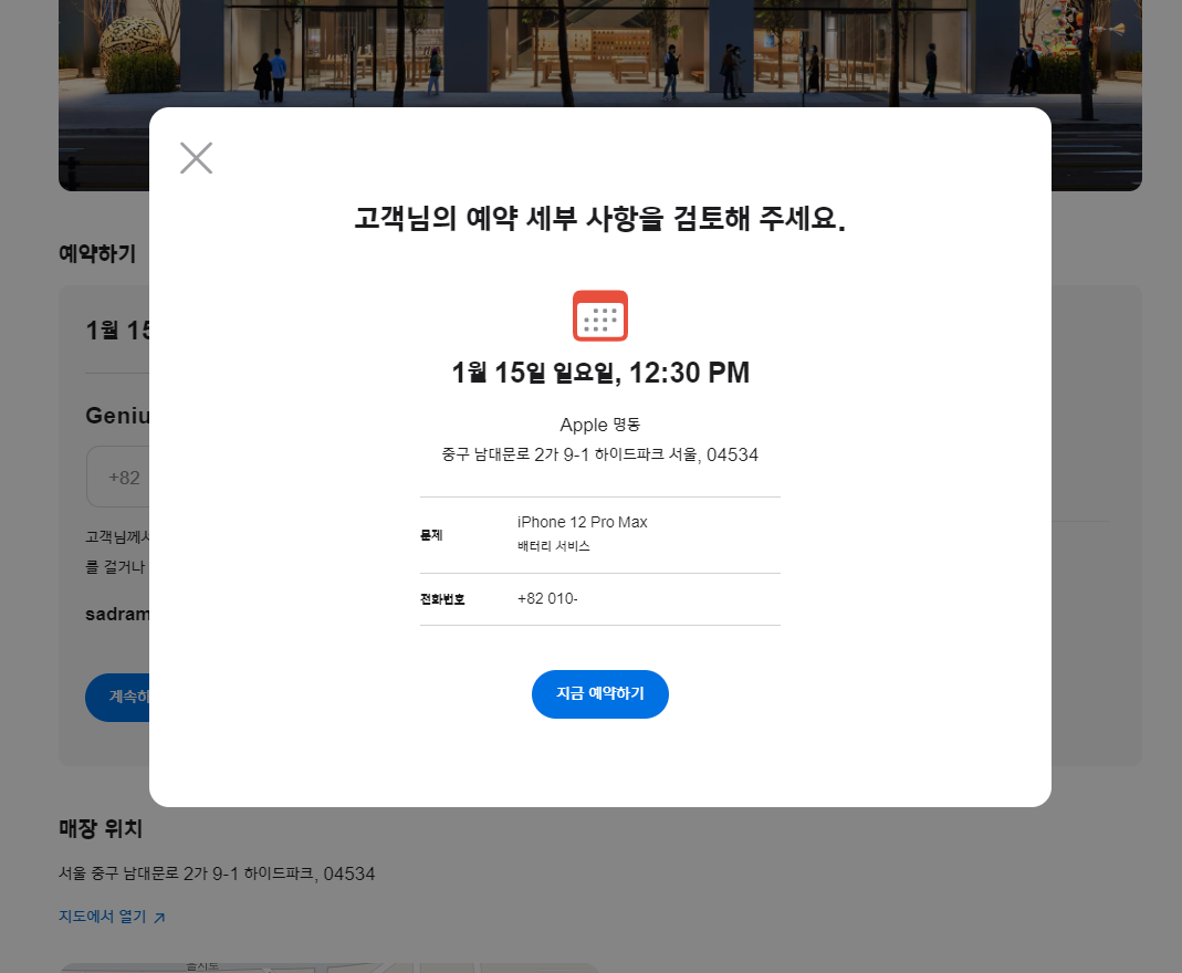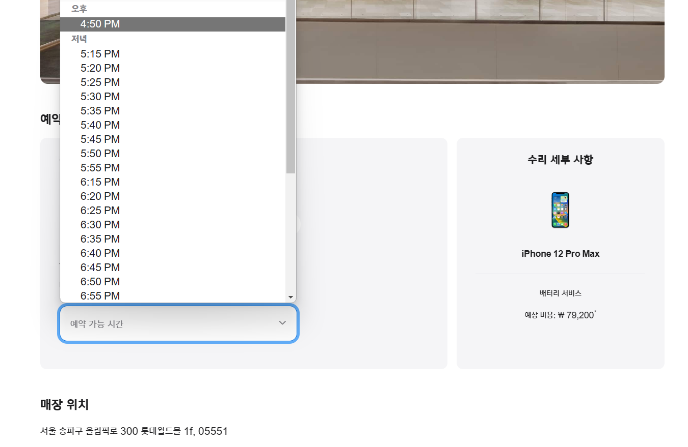 보통 배터리 교체하는데 지니어스바 기준으로 1~2시간 정도 걸린다는 후기를 본 적이 있어서, 이 정도면 괜찮을 것 같아서 해당 시간대로 예약을 진행했습니다.
