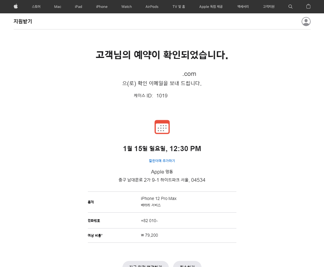 예약 당시 등록한 스마트폰 번호와 애플 ID에 등록된 E-mail 주소로 예약 관련 안내 메시지가 전송됩니다.