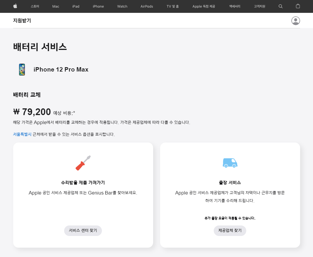 애플의 제품을 이용하는 분들은 수리 비용에 부담을 느껴서 사설 서비스 센터를 이용하는 경우가 더러 있는데, 저는 배터리 외에 다른 문제는 전혀 없는 상태이고, 사설 서비스에 대한 신뢰가 없어서 공식 서비스 센터를 통해서 배터리 교체를 진행하려고 합니다.