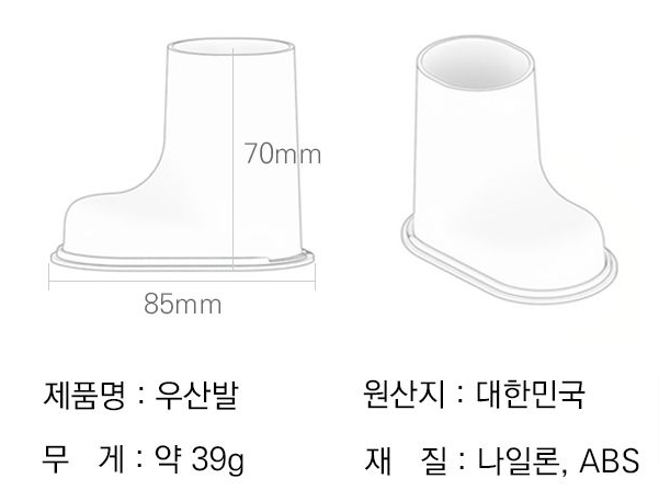 와디즈 펀딩 상세페이지를 통해서 제품의 이미지를 봤을 땐, 사람들이 신는 장화처럼 말랑말랑한 고무 재질의 제품일 줄 알았는데, 이 제품... 딱딱한 플라스틱이라서 실망을 많이 했습니다.