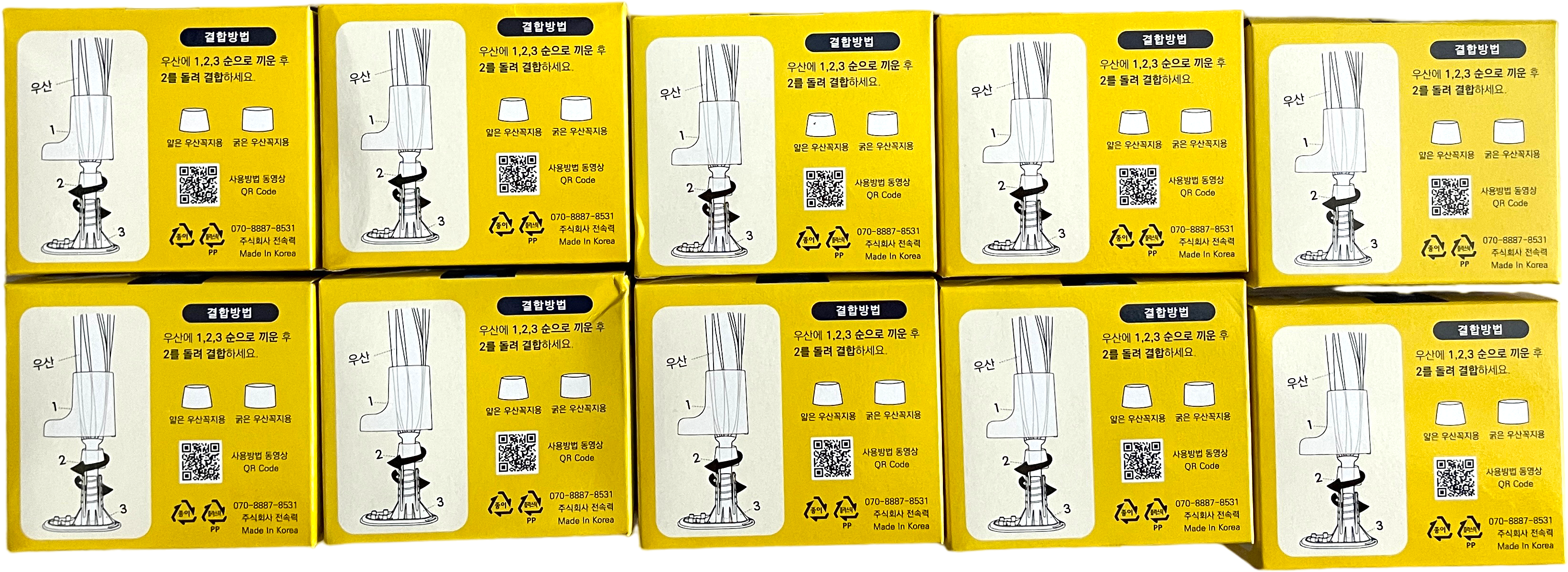 우산발은 다양한 굵기의 우산 끝에 맞춰서 제품을 장착시킬 수 있도록 '얇은 우산꼭지용'과 '굵은 우산꼭지용' 부품을 넣어뒀는데, 삼양라면 우산의 경우 '얇은 우산꼭지용' 부품을 이용해서 무리없이 장착이 가능했지만, 이상하게도 국순당 막걸리 우산에는 '얇은 우산꼭지용' 부품을 결합하려 하면 뻑뻑한 느낌이 들고, '굵은 우산꼭지용'은 너무 헐렁해서 조여지지가 않는 모습을 볼 수 있었습니다.