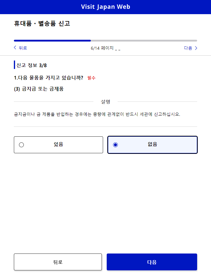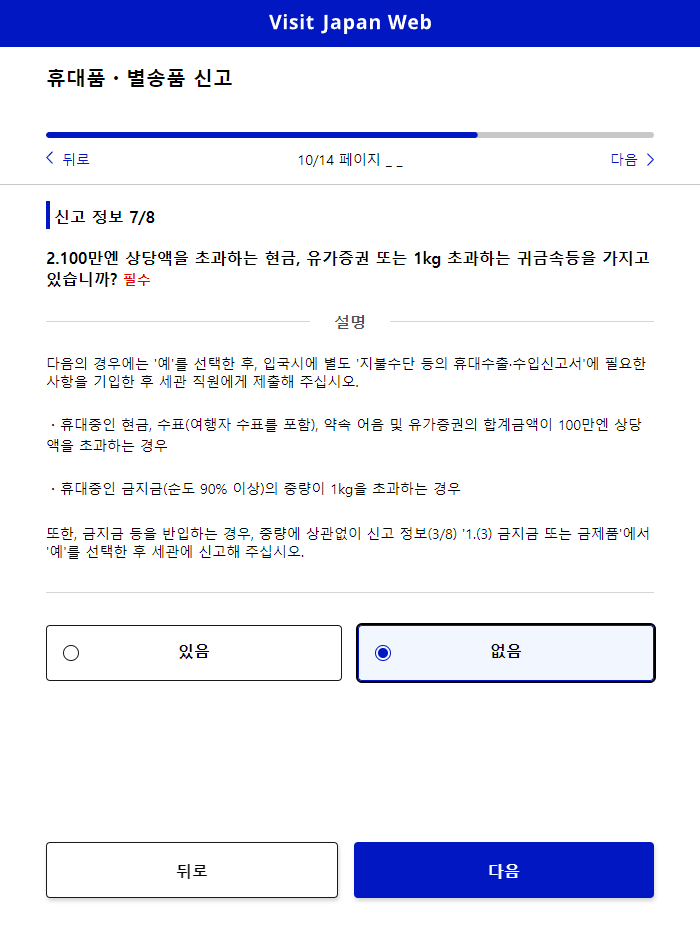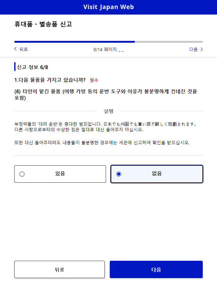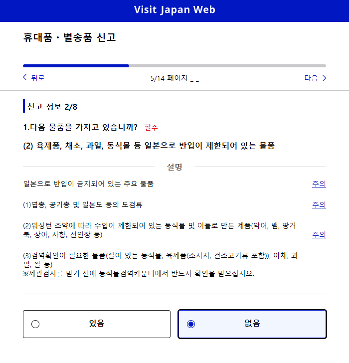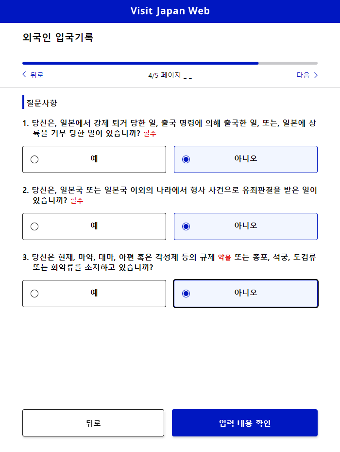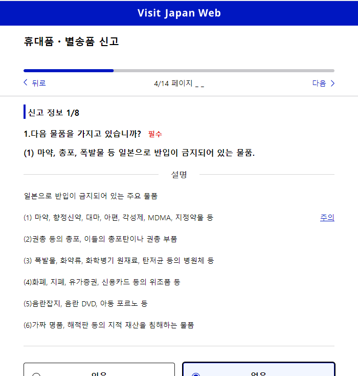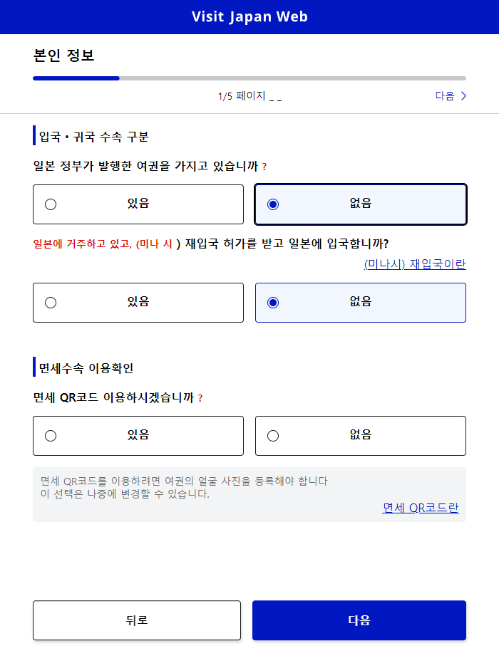 일본에 거주하고 있고, 재입국 허가를 받고 일본에 입국합니까?라는 질문에도 해당이 없으니 [없음]을 눌러줍니다.