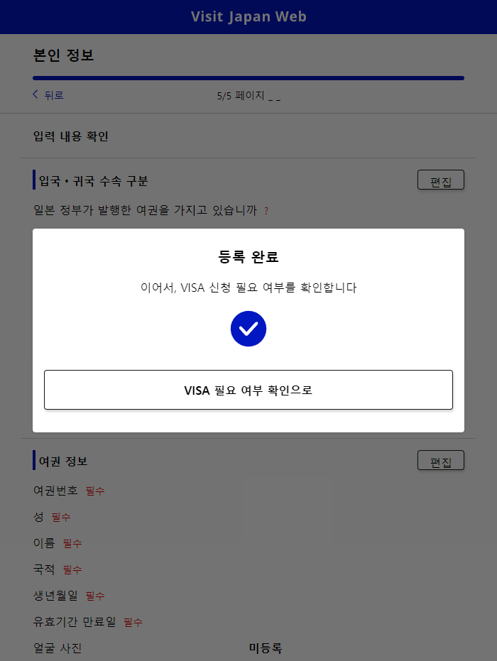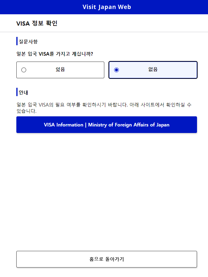 VISA 필요 여부 확인으로라는 팝업이 뜨는데, 일본 입국 VISA를 가지고 계십니까?라는 질문에 저는 VISA가 없으므로 [없음]을 선택했습니다.