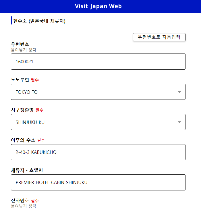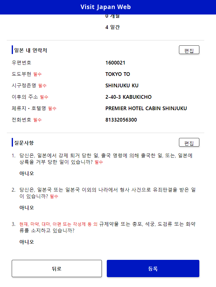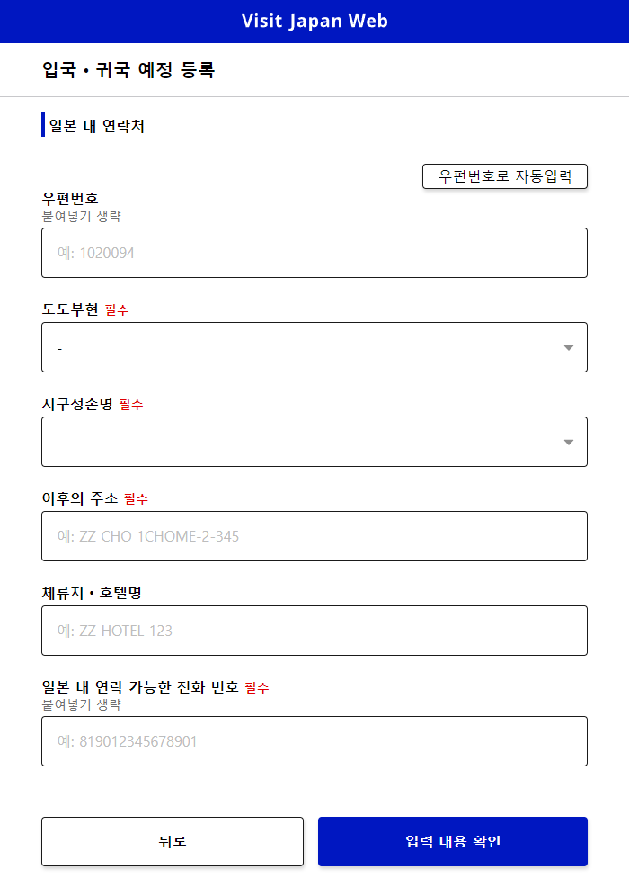 일본 내 연락처를 등록해야 하는데, 여행 중 머무를 숙소 정보를 입력해주면 됩니다.