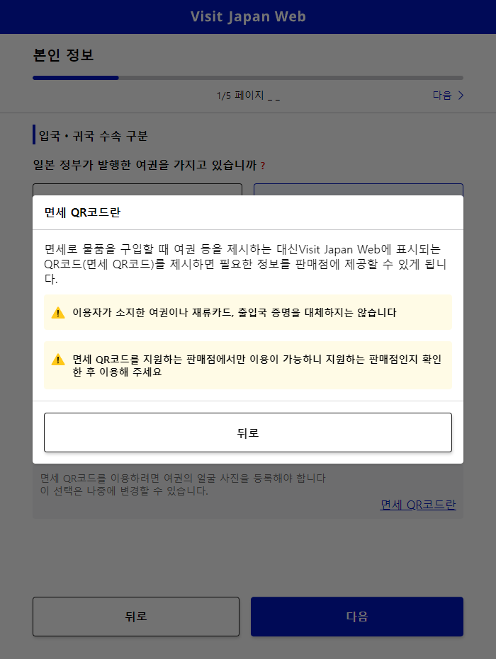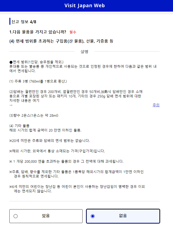 면세 QR코드를 이용할 것인지를 묻는 질문이 있는데, 면세 QR코드는 이를 지원하는 판매점에서만 이용이 가능하다고 하고, 먼저 일본 여행을 방문한 다른 사람들의 후기를 찾아보니 제한이 많다고 해서 저는 [없음]을 선택했습니다.