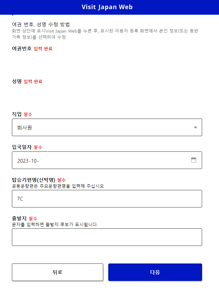 여행명, 일본 도착 예정일, 항공사명, 항공기 편명을 입력하고 [다음] 버튼을 눌러 줍니다.