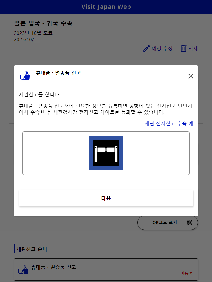입국심사 준비 항목 아래 쪽과 세관신고 준비 항목 아래 쪽에 각각 [QR코드 표시]가 활성화된 것을 확인할 수가 있는데요, 각 각의 버튼을 눌러서 QR코드를 확인하고, 해당 QR코드를 스크린샷 찍어서 스마트폰에 저장해둡니다.