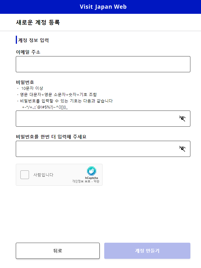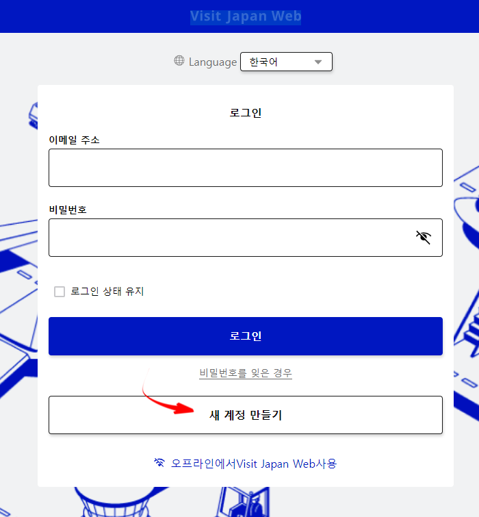 비짓 재팬 웹 사이트에 접속하여 하단의 '새 계정 만들기' 버튼을 눌러줍니다.