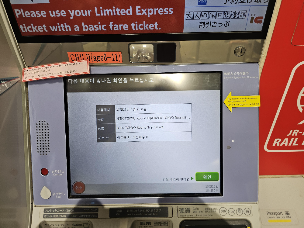 3. 이용권 판매기 디스플레이 상단의 언어 선택에서 '한국어'를 선택하고, 디스플레이 좌측에 부착된 노란색 화살표를 따라서 N'EX TOKYO Round Trip Ticket(Valid for 14 days) 버튼을 누릅니다.
