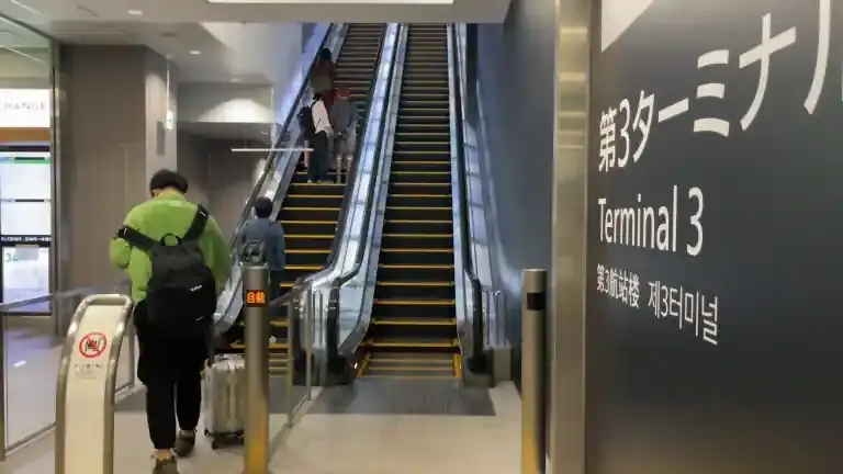 나리타 국제공항 제3터미널에는 나리타 익스프레스(이하 넥스)를 탑승하기 위해서는 나리타 국제공항 제2터미널로 이동해야 하는데, 바닥에 표시된 Terminal2 표시를 따라 도보로 이동해도 되고, 무료 셔틀버스를 이용하여 이동할 수도 있습니다.