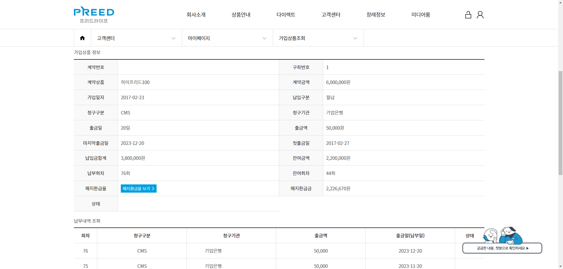 홈페이지 상에는 76회차 해약환급금이 2,226,670원으로 안내되었지만, 상담원과의 통화를 통해서 2,380,000원을 환급받는다는 안내를 받게 되었습니다.