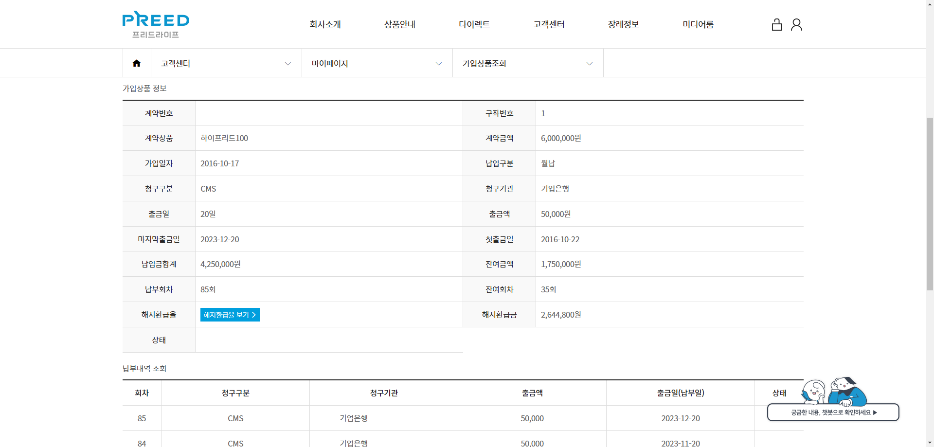 2016년 10월에 가입한 상품은 현재까지 85회차(납입금액 4,250,000원) 납입을 하였고, 이 상태라면 2026년 11월에 120회차 납입을 끝마치게 됩니다.