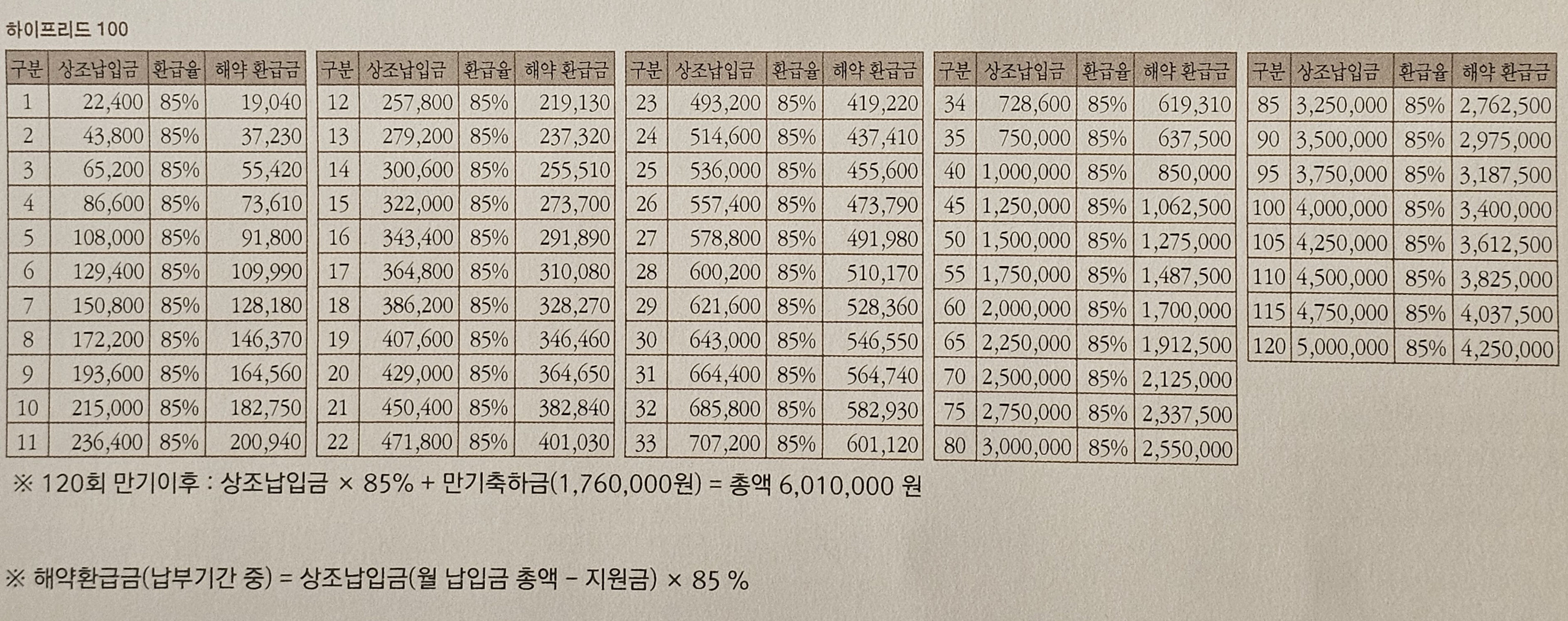 중도 해지시 상품 구입을 할 때 할인받았던 100만원을 제외하고, 남은 금액 중에서 85%만 돌려준다는 이야기죠.
