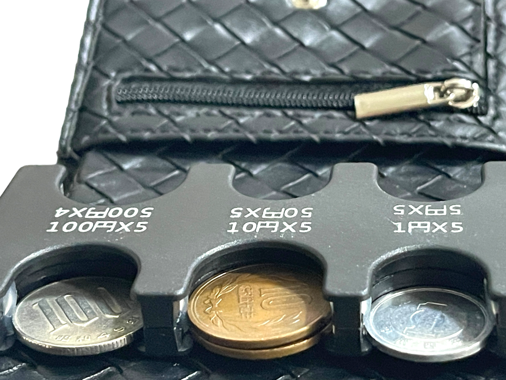 6종의 엔화 동전만 담을 수 있는 플라스틱 지갑과 동전 뿐만 아니라 지폐까지 보관 가능한 가죽 지갑.