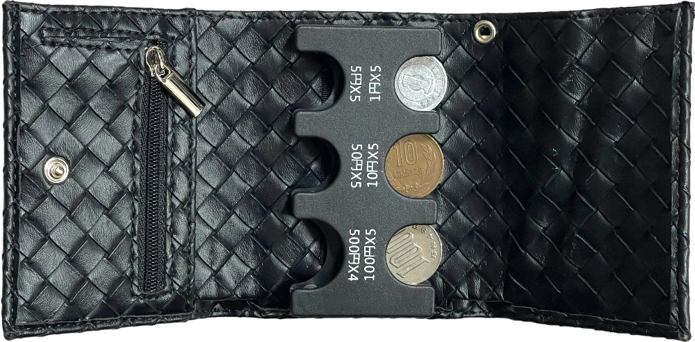6종의 엔화 동전만 담을 수 있는 플라스틱 지갑과 동전 뿐만 아니라 지폐까지 보관 가능한 가죽 지갑.