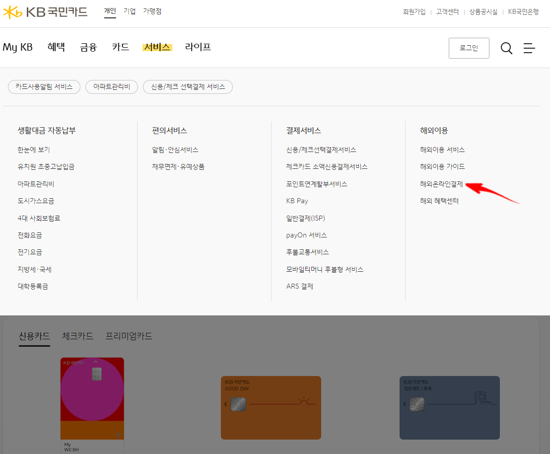 상단의 메뉴 중 [서비스] 항목을 선택하고, [해외온라인결제]를 선택합니다.