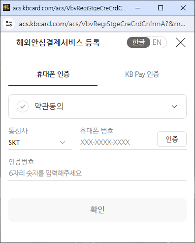 휴대폰 인증과 KB Pay 인증 중 편한 방법으로 인증을 시도합니다.