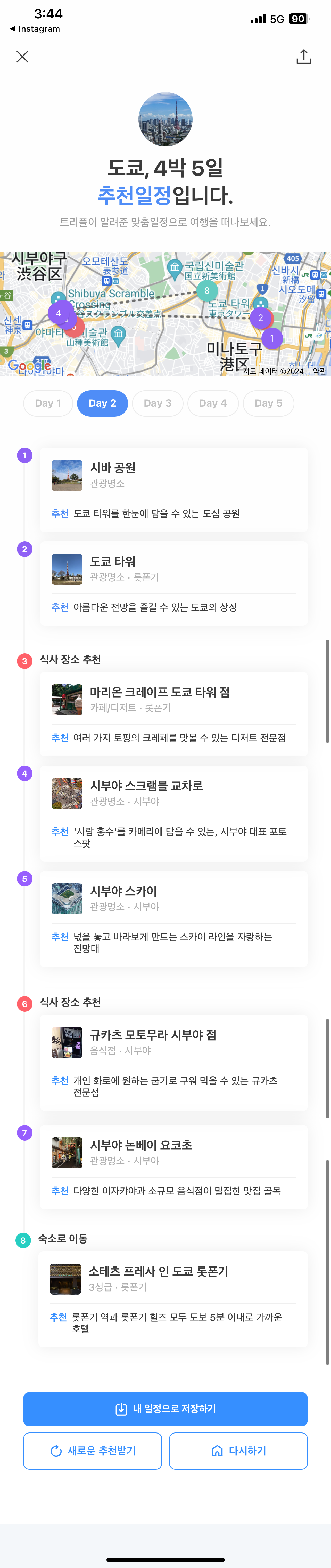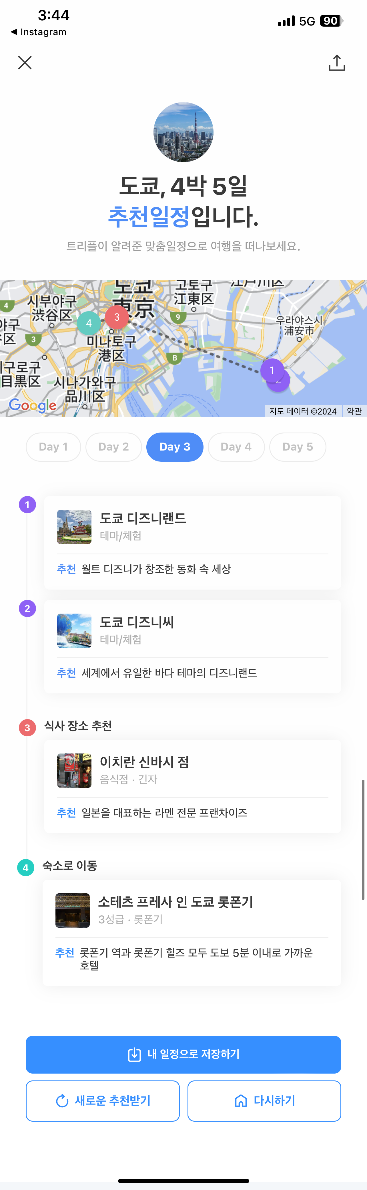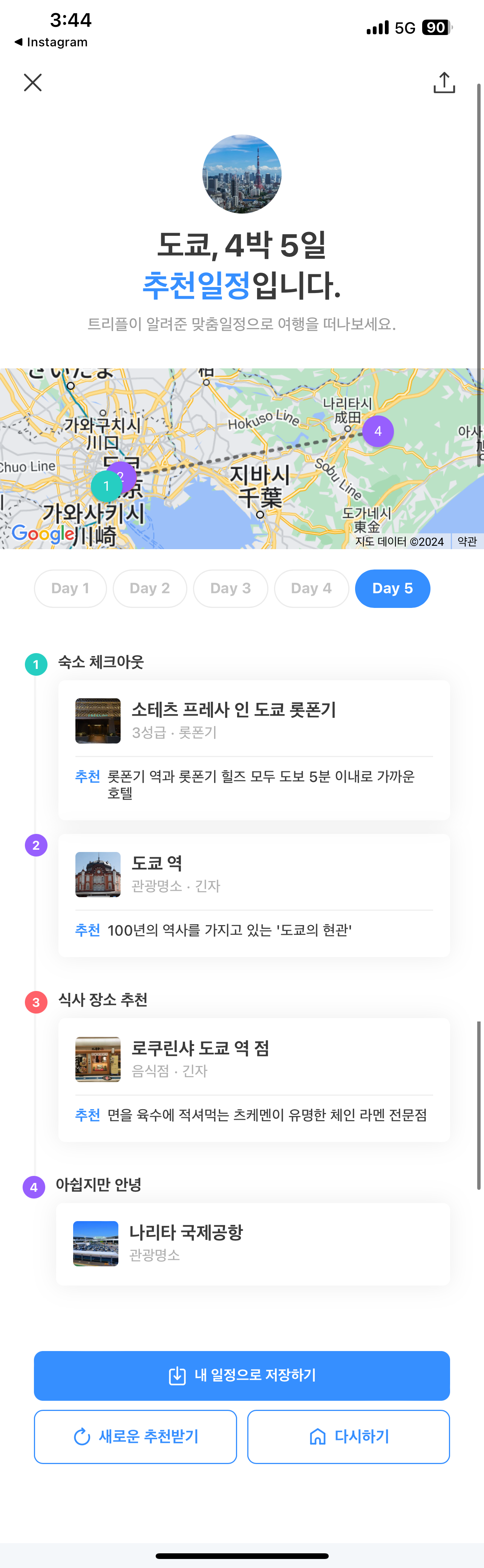 지방에 살고 있는 저로서는 오후 늦은 시간 비행기를 탑승할 수가 없기에 5일차 일정은 비워두는데, 이런 제 사정을 알리가 없는 트리플 AI는 5일차 일정도 추천해줬습니다.