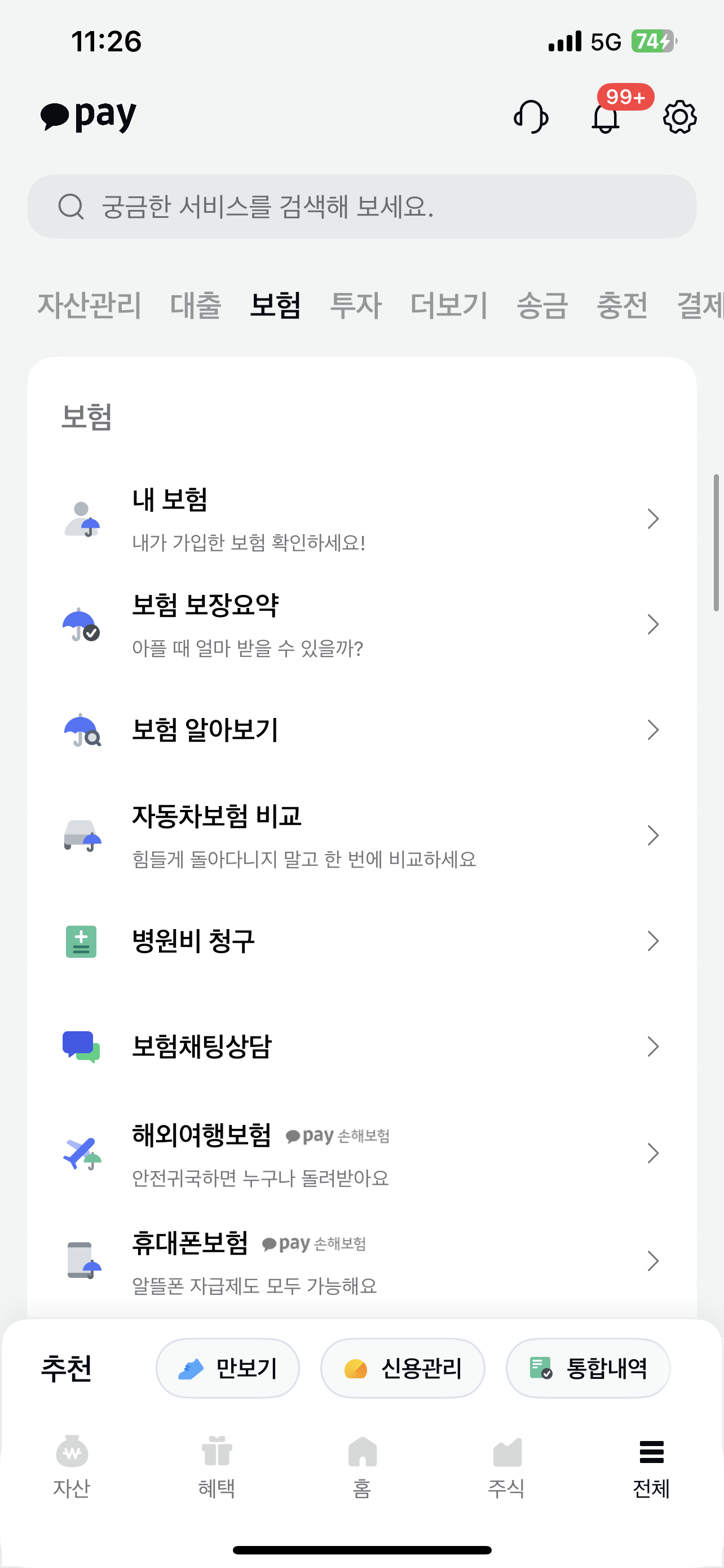 카카오페이손해보험의 보험 상품에 가입하기 위해서는 카카오톡 또는 카카오페이 어플을 통해서 [보험] 항목에 접속해야 합니다.