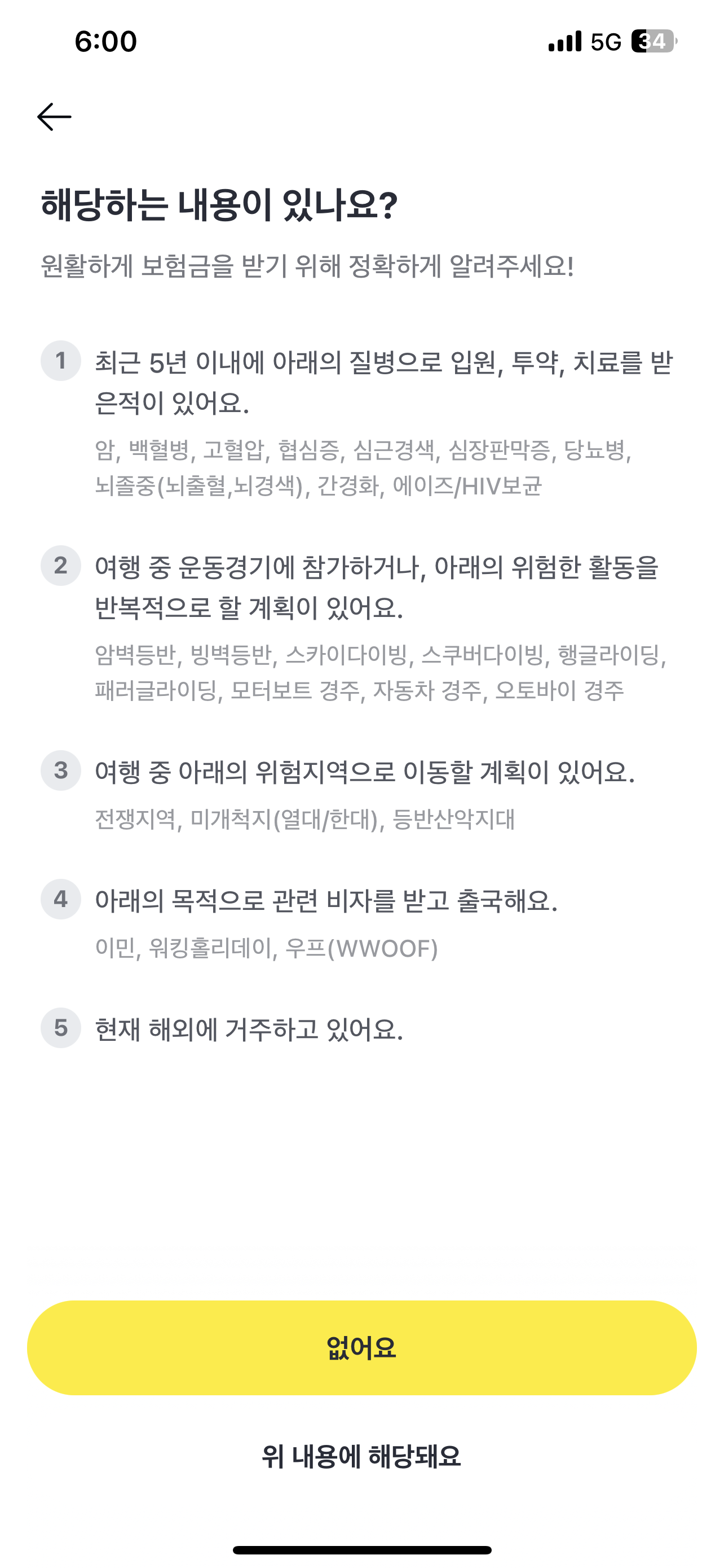 보험상품을 선택한 뒤에 [다음] 버튼을 눌러주고, 안내된 내용 중에 하나라도 해당되는 것이 있다면 [위 내용에 해당돼요]를, 없다면 [없어요]를 눌러주고, 보험 상품 약관과 보장 내용 등을 확인한 뒤에 보험료를 계산해주면 보험 가입이 끝납니다.