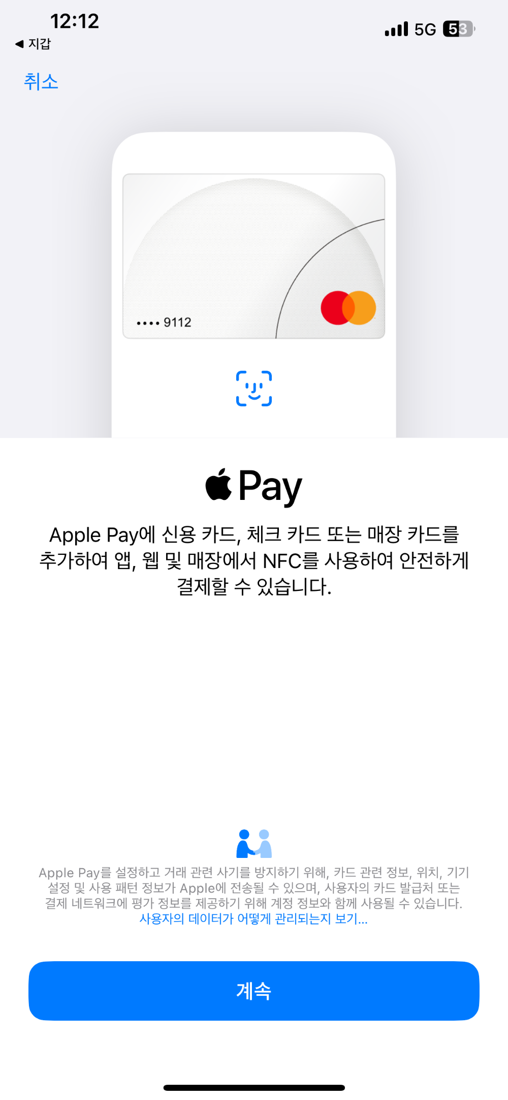 안내에 따라서 애플페이에 보유하고 있는 현대카드를 등록하고 [계속] 버튼을 눌러줍니다.